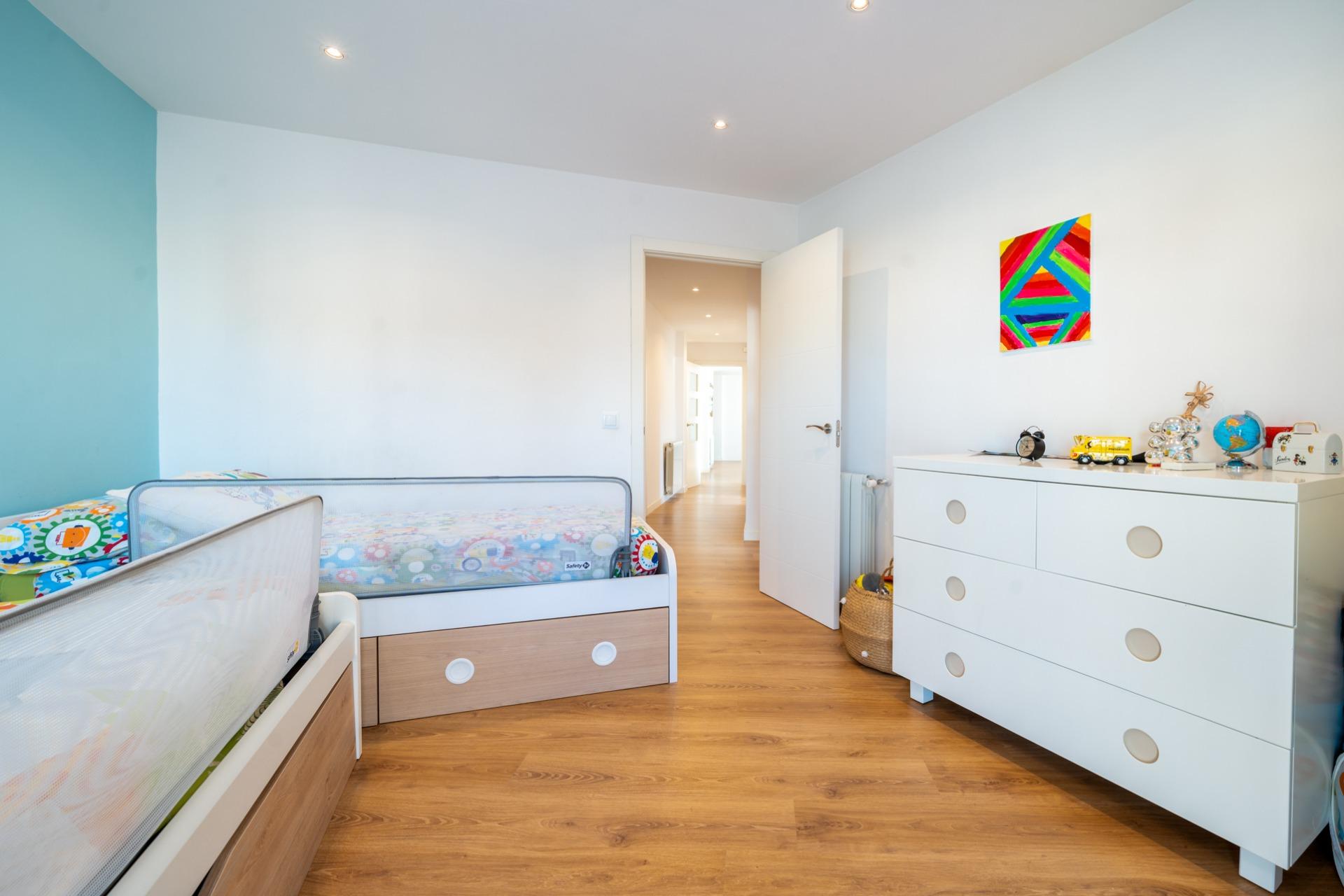 El inmueble está estratégicamente distribuido en cuatro habitaciones dobles bien iluminadas, ideales para familias o para quienes buscan espacio adicional, con armarios empotrados en todas las habitaciones, para optimizar el espacio. Cuenta también con dos baños completos, uno de ellos en suite con ducha y otro para invitados con bañera. Dispone también de zona de coladuría, con lavadora y secadora, así como una pila para lavar a mano las prendas más delicadas.