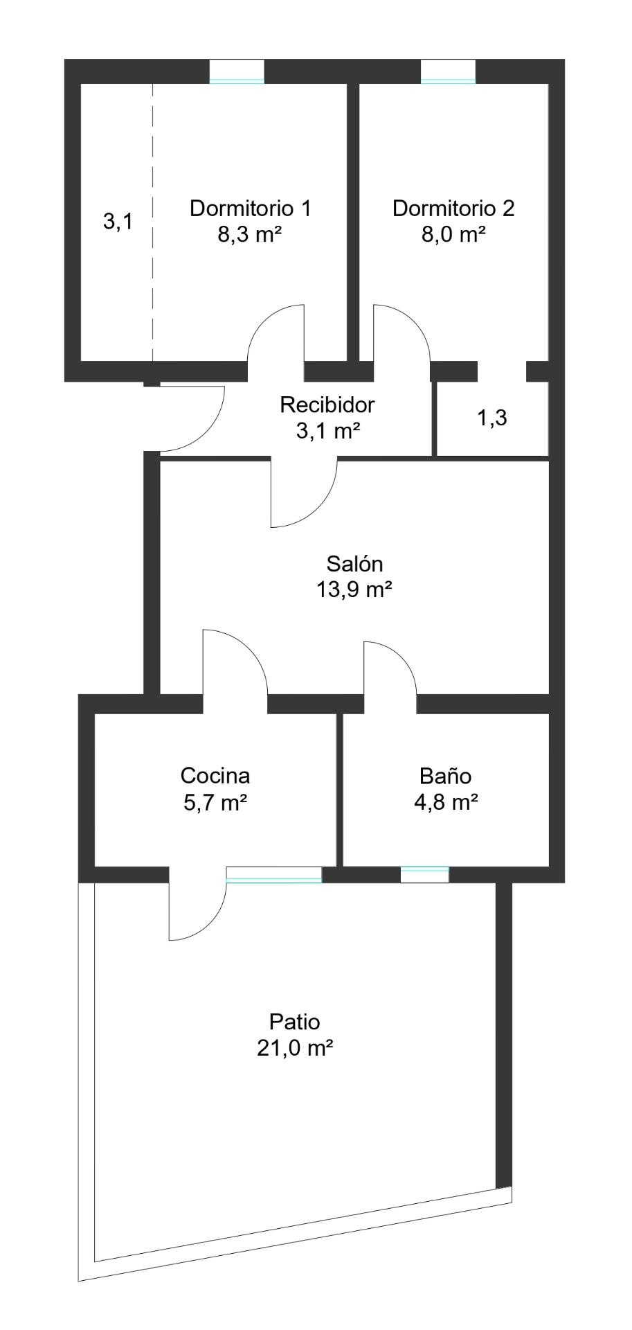 Consta de 65 m2 construidos, divididos en 2 habitaciones dobles, un bao completo, saln comedor, cocina independiente y patio interior.