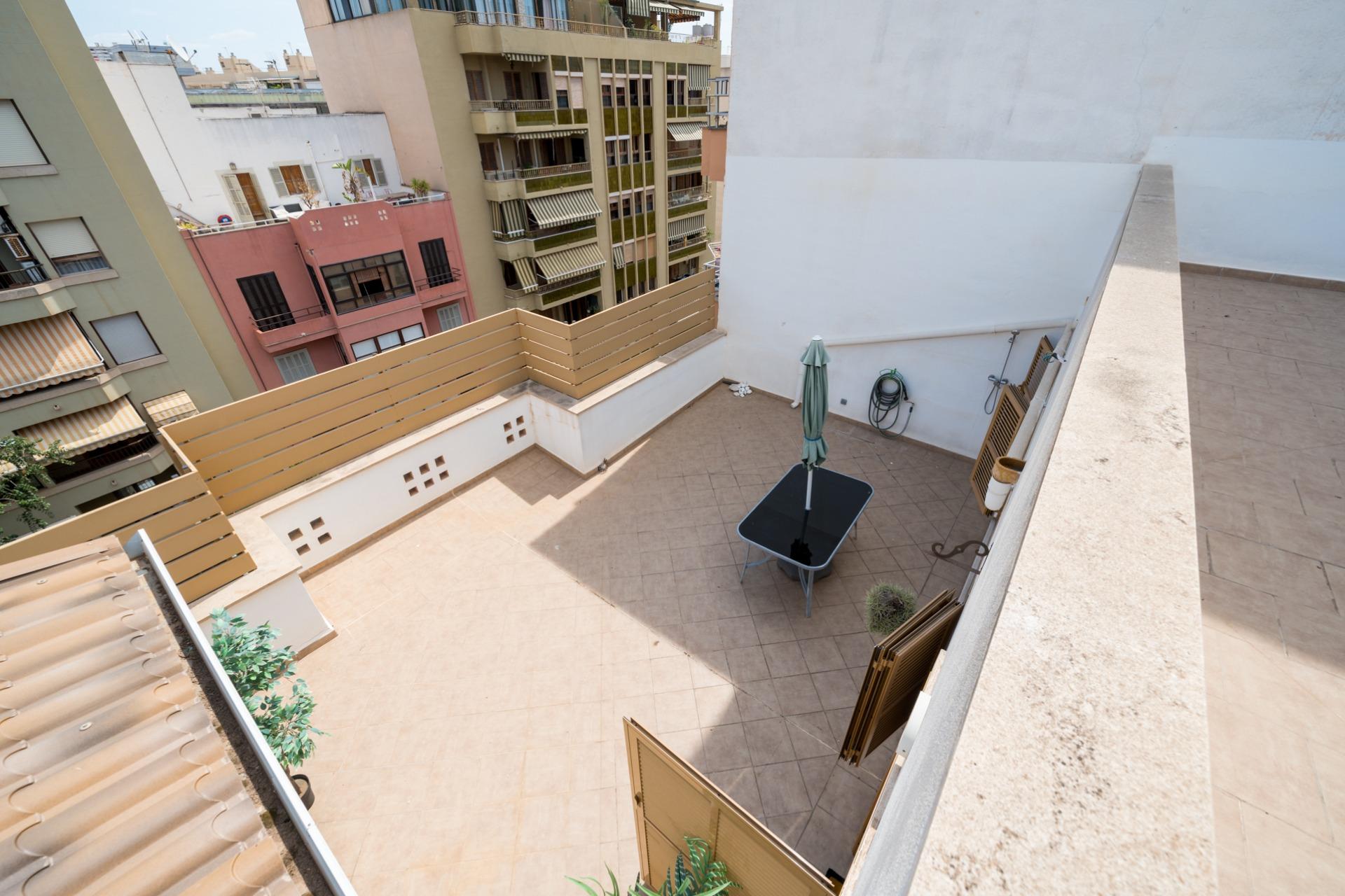 Exclusiva propiedad de dos plantas con terraza privada en Son Armadams. Conjunto de 240 m² construidos: la vivienda principal en tercera planta, junto con una planta superior reformada ideal para invitados o estudio, y salida a una terraza de 65 m².