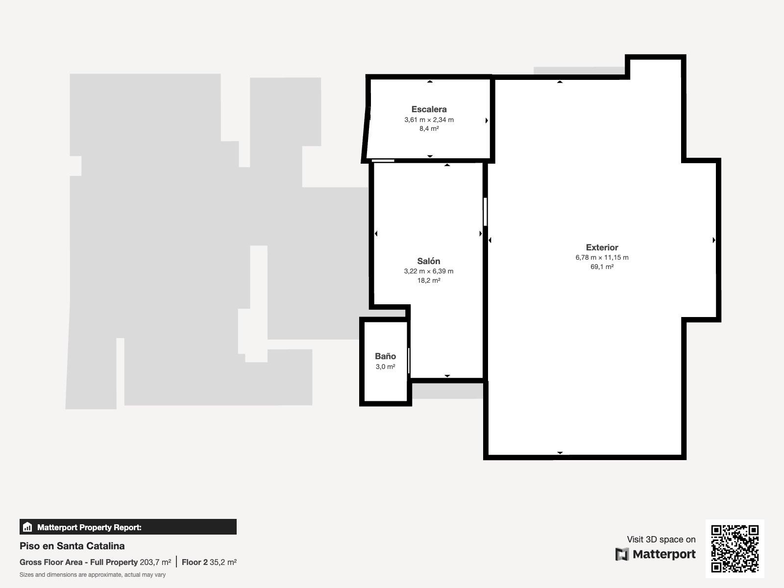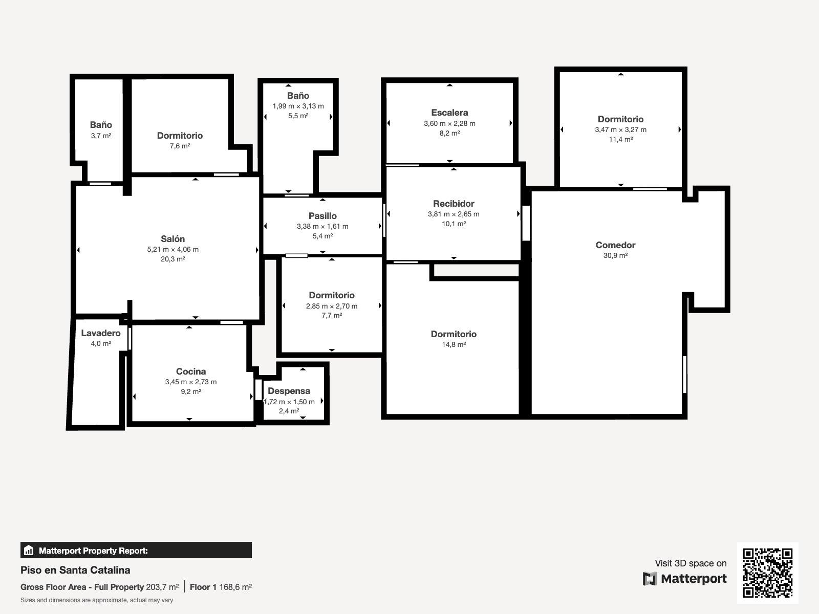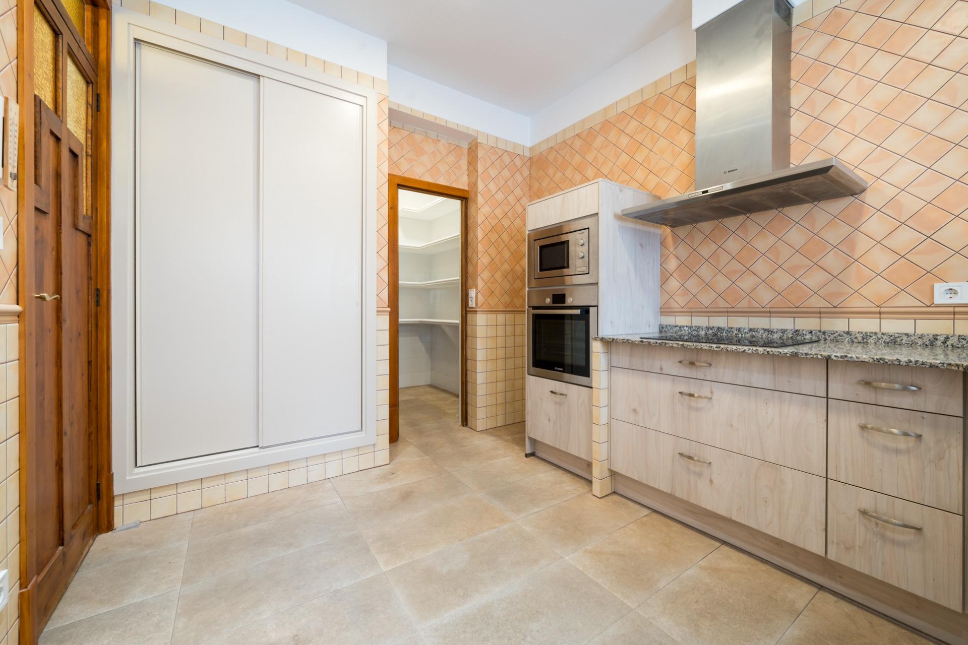 La vivienda principal, en el tercer piso, ofrece 155 m² distribuidos en dos luminosos salones de 31 y 21 m², cocina equipada con despensa y lavandería, cuatro dormitorios (tres dobles y uno simple) con armarios empotrados y dos baños completos. El edificio no dispone de ascensor, pero cuenta con silla salvaescaleras para facilitar el acceso.
