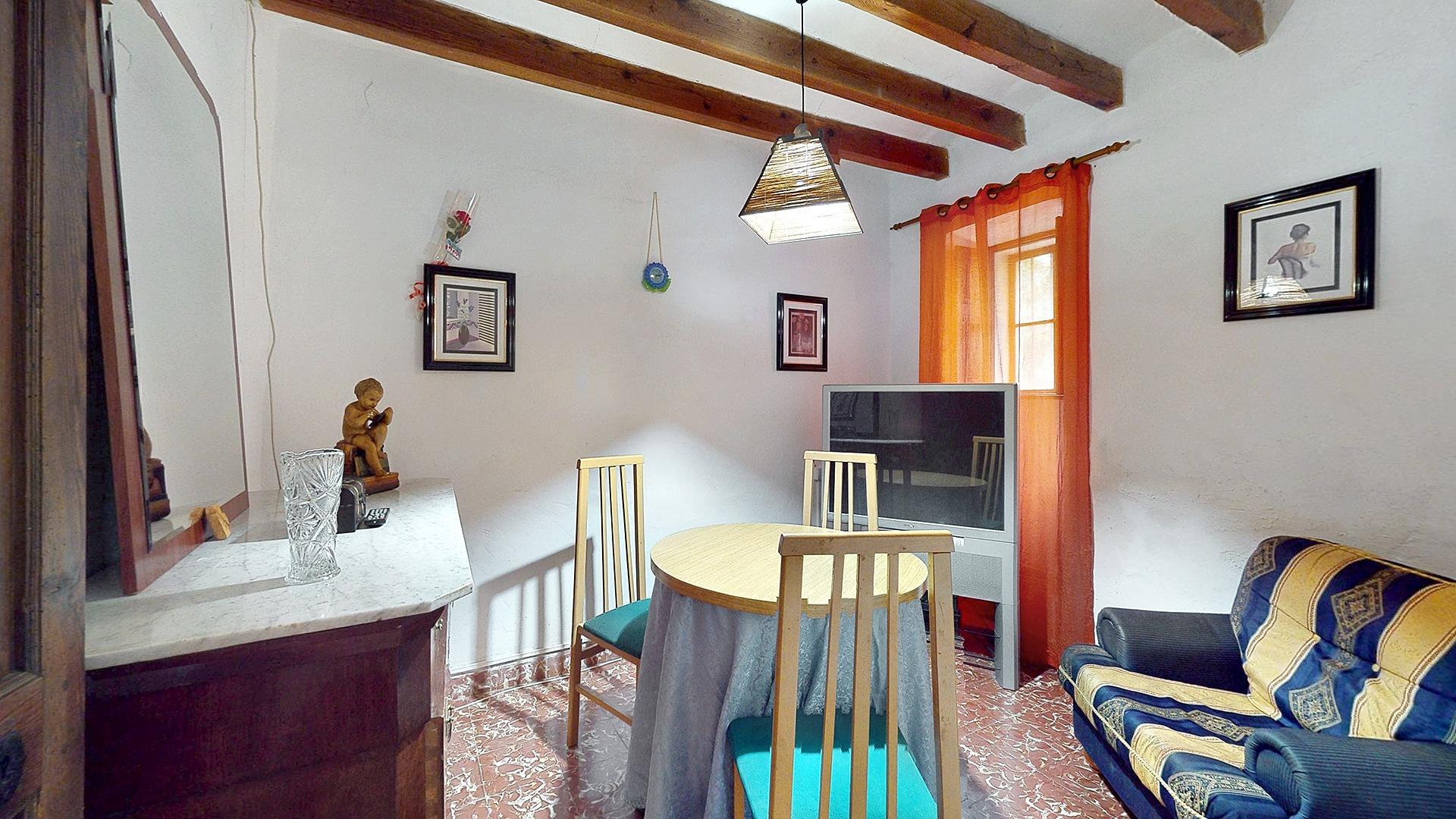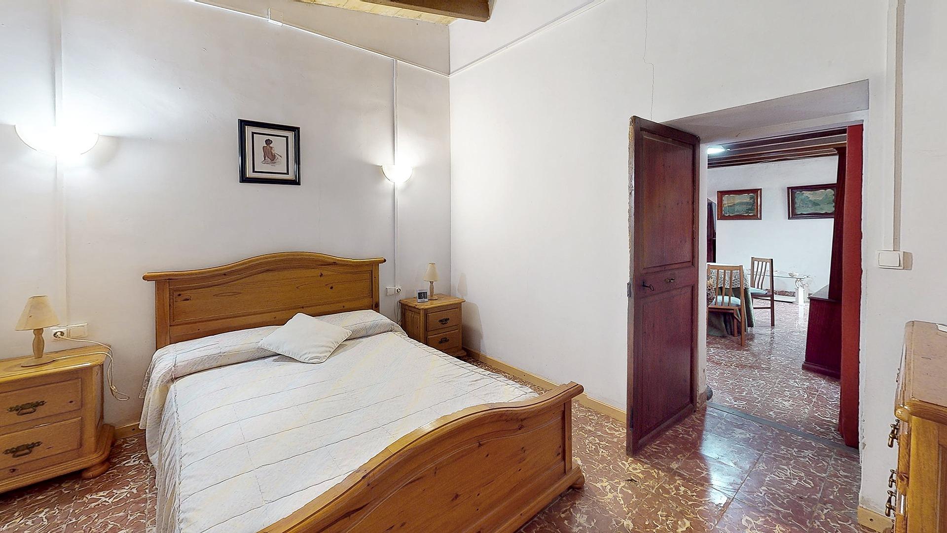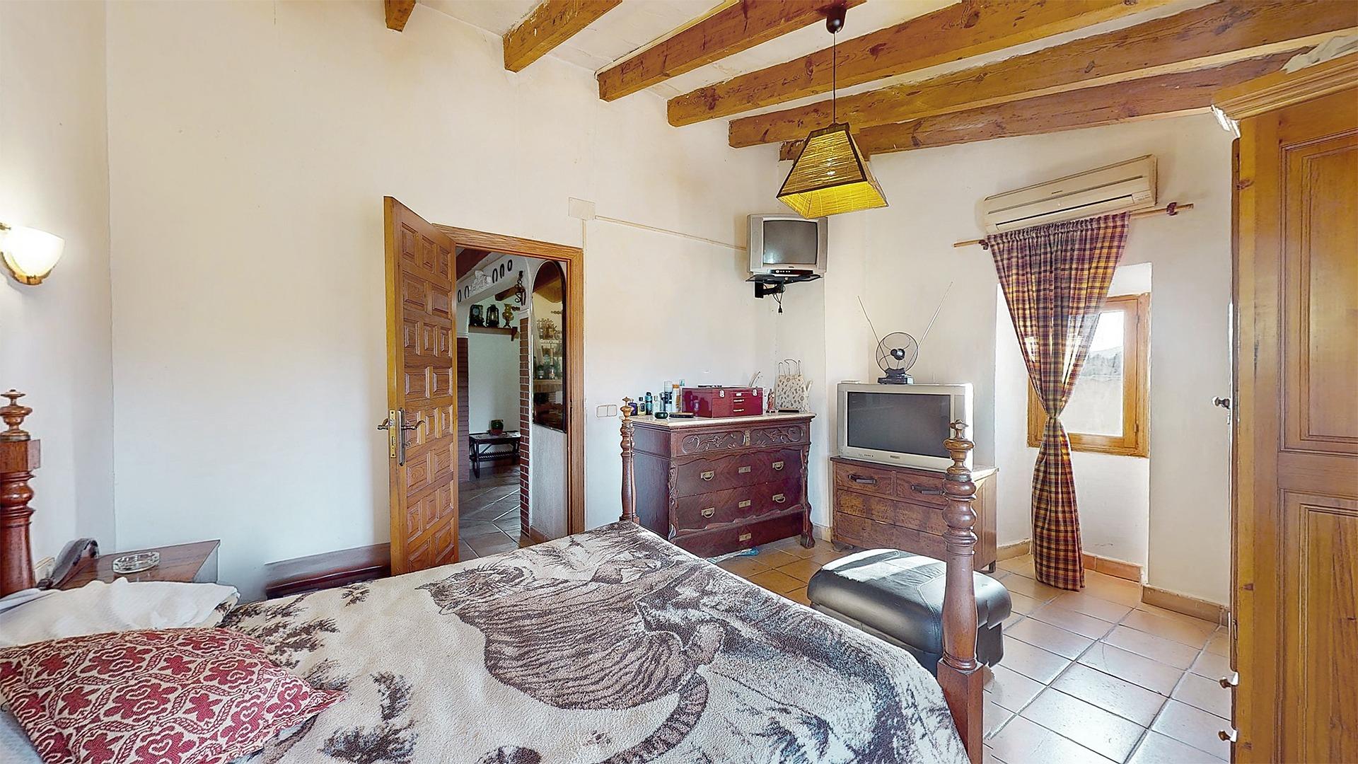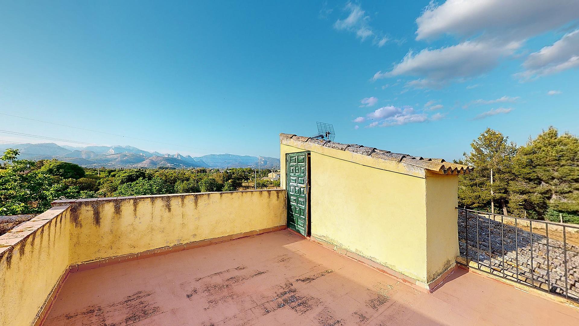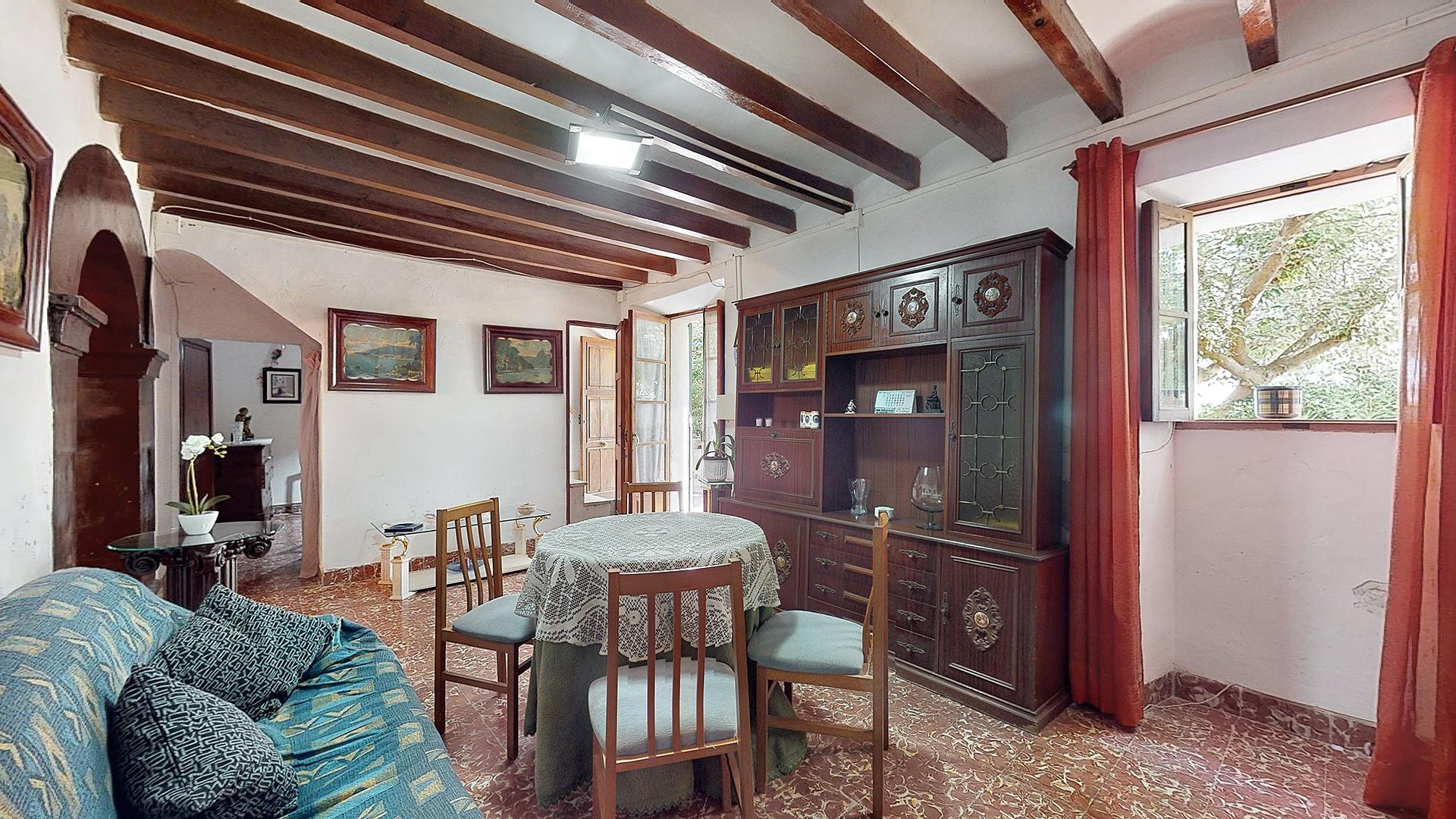 Al entrar nos recibe un comedor distribuido en dos estancias separadas por otro arco y de manera diáfana. Todo con el carácter rústico mallorquín. El salón distribuye la vivienda de arriba en un balcón hacia la parte de entrada de la vivienda (sur), 2 habitaciones dobles y una simple con salida a terraza, un baño y una cocina independiente. Además de otras escaleras que nos dirigen a la terraza de la azotea con vistas 360º del terreno.