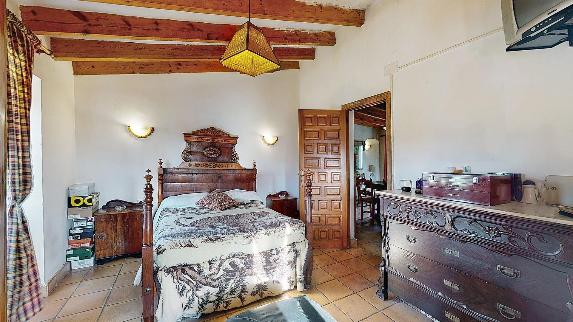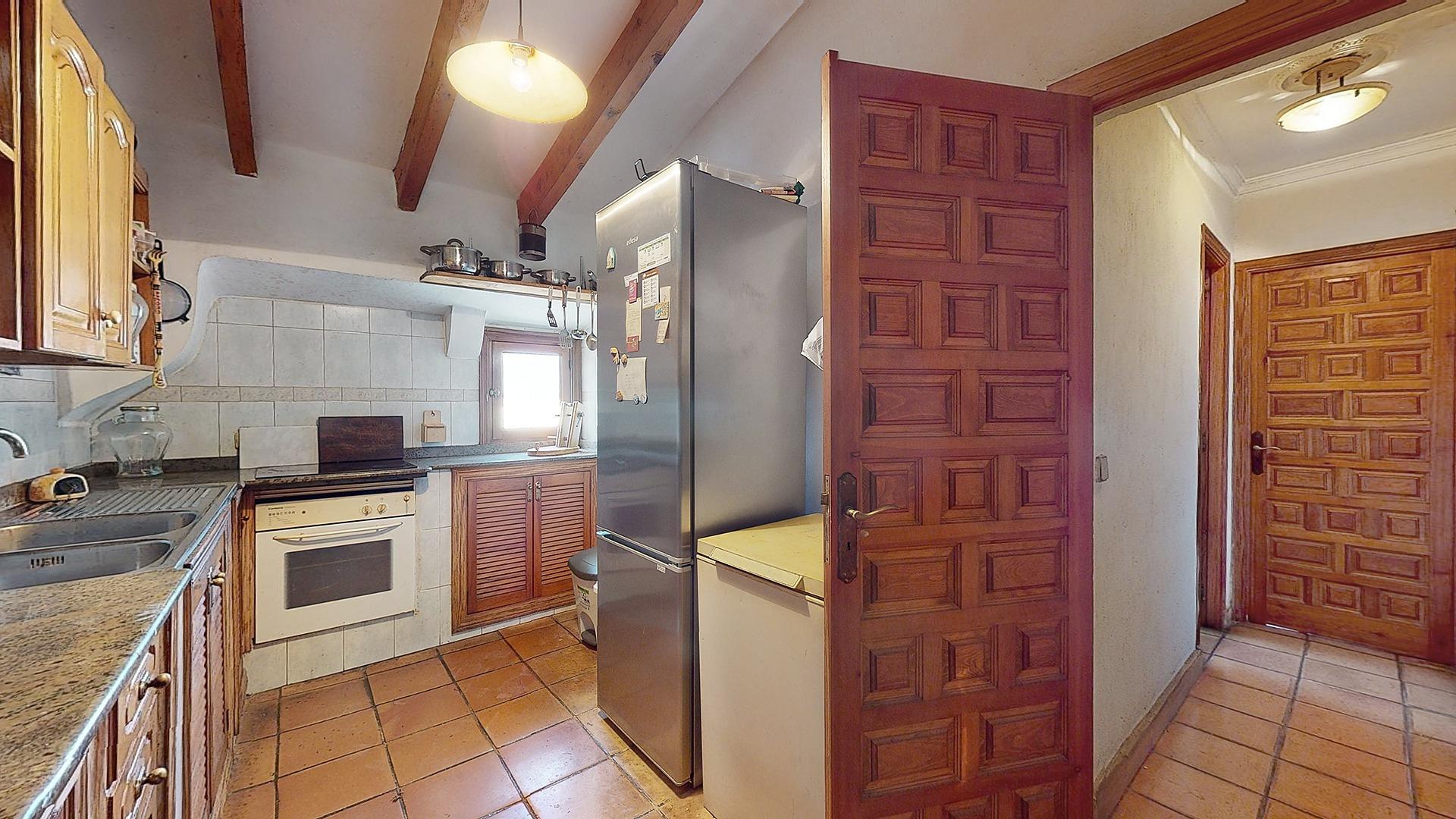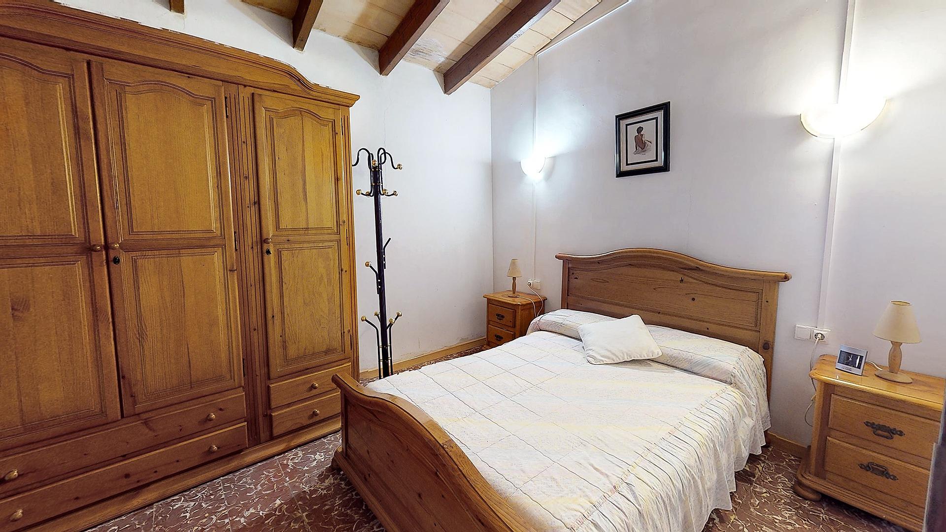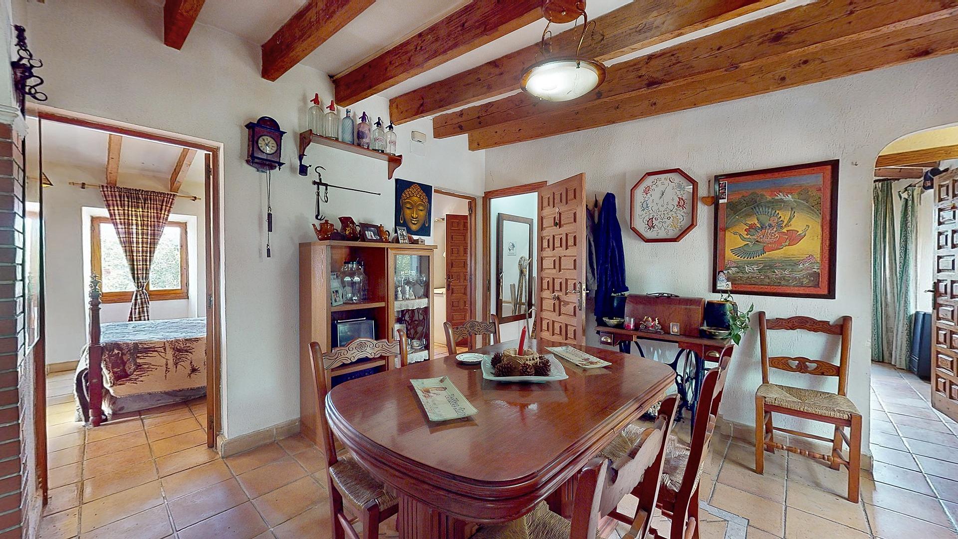 Al entrar nos recibe un comedor distribuido en dos estancias separadas por otro arco y de manera diáfana. Todo con el carácter rústico mallorquín. El salón distribuye la vivienda de arriba en un balcón hacia la parte de entrada de la vivienda (sur), 2 habitaciones dobles y una simple con salida a terraza, un baño y una cocina independiente. Además de otras escaleras que nos dirigen a la terraza de la azotea con vistas 360º del terreno.