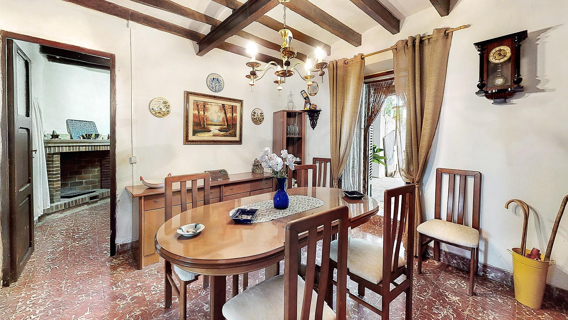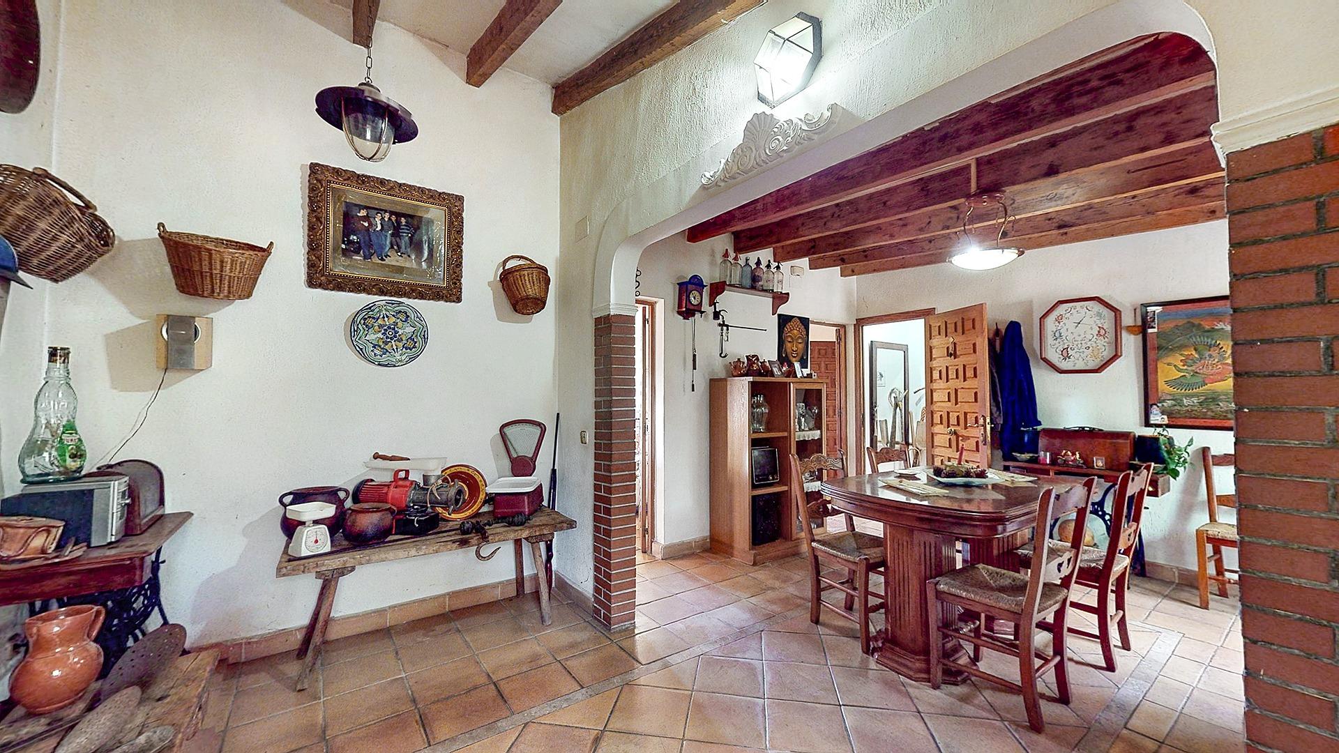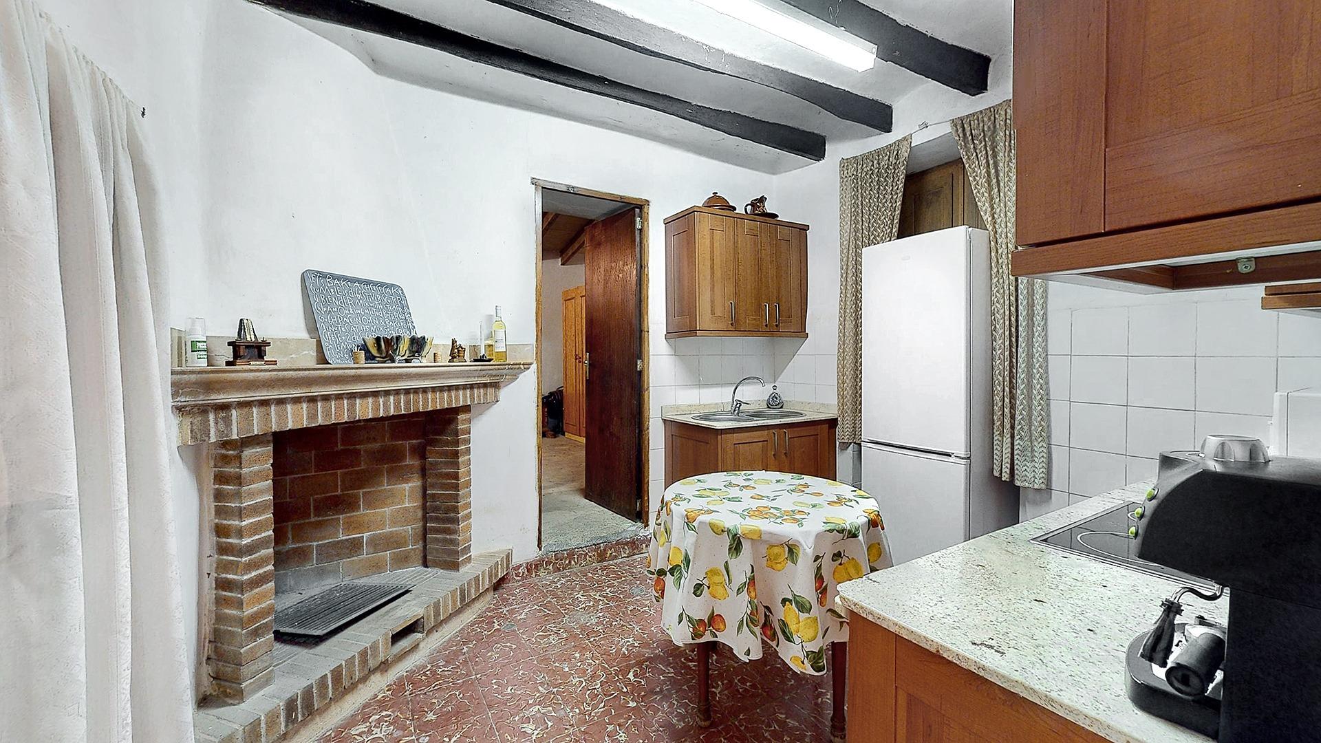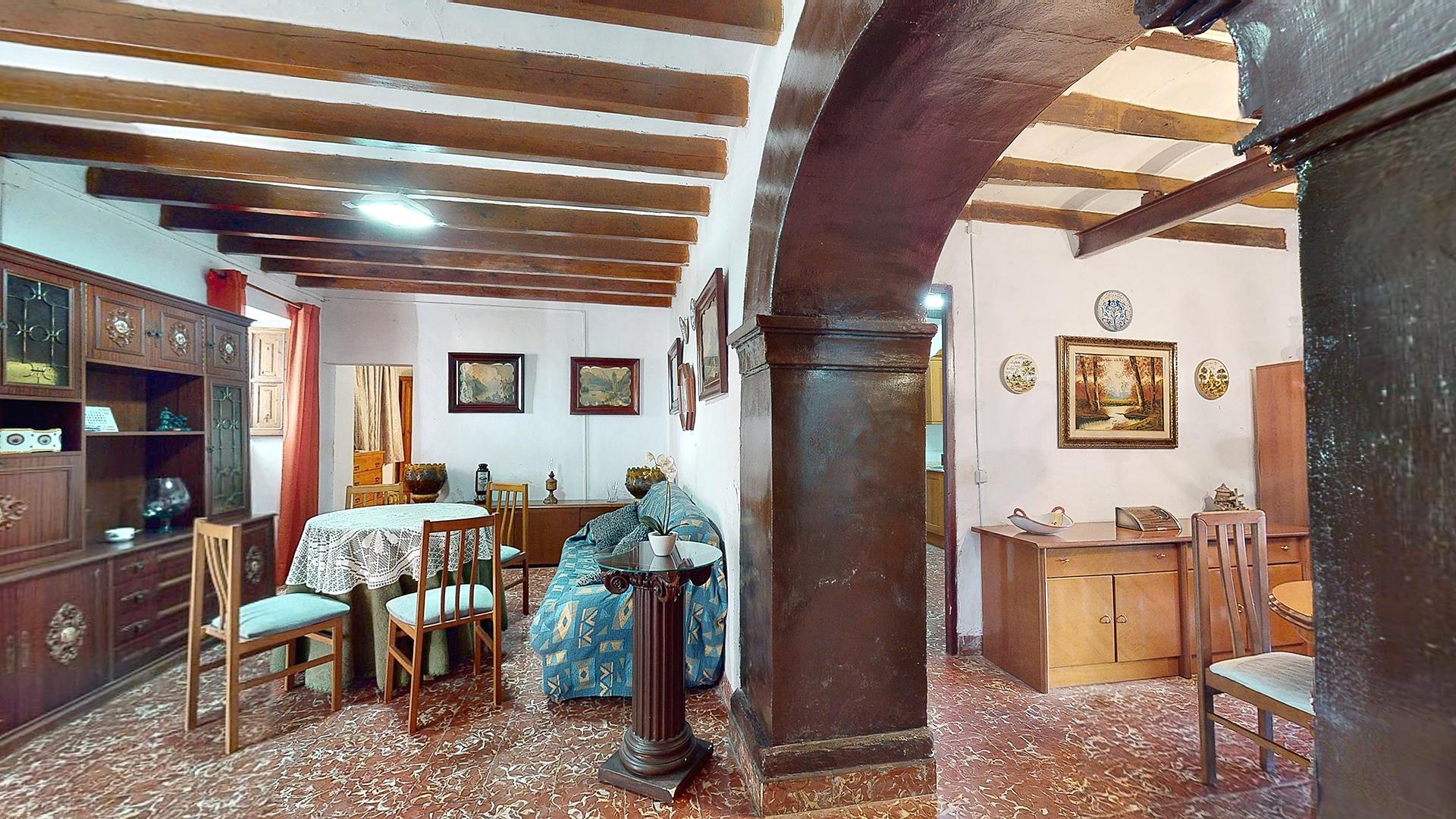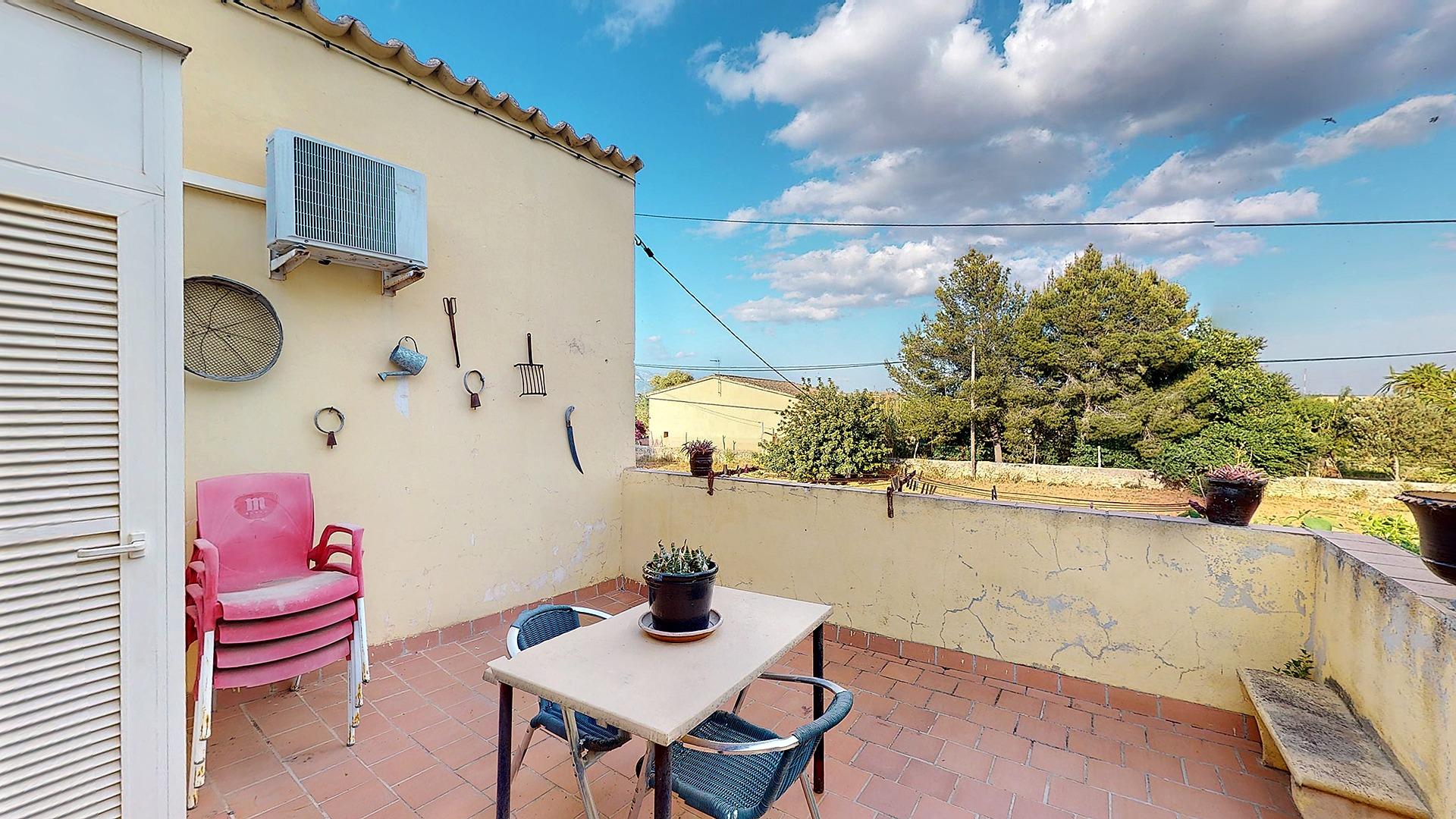 Al entrar nos recibe un comedor distribuido en dos estancias separadas por otro arco y de manera diáfana. Todo con el carácter rústico mallorquín. El salón distribuye la vivienda de arriba en un balcón hacia la parte de entrada de la vivienda (sur), 2 habitaciones dobles y una simple con salida a terraza, un baño y una cocina independiente. Además de otras escaleras que nos dirigen a la terraza de la azotea con vistas 360º del terreno.