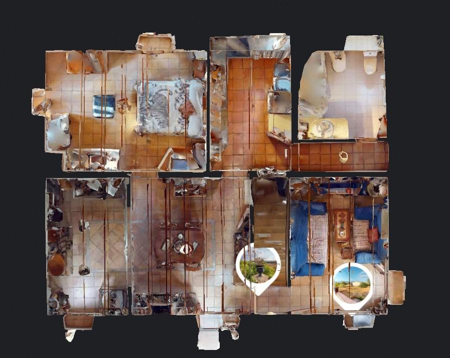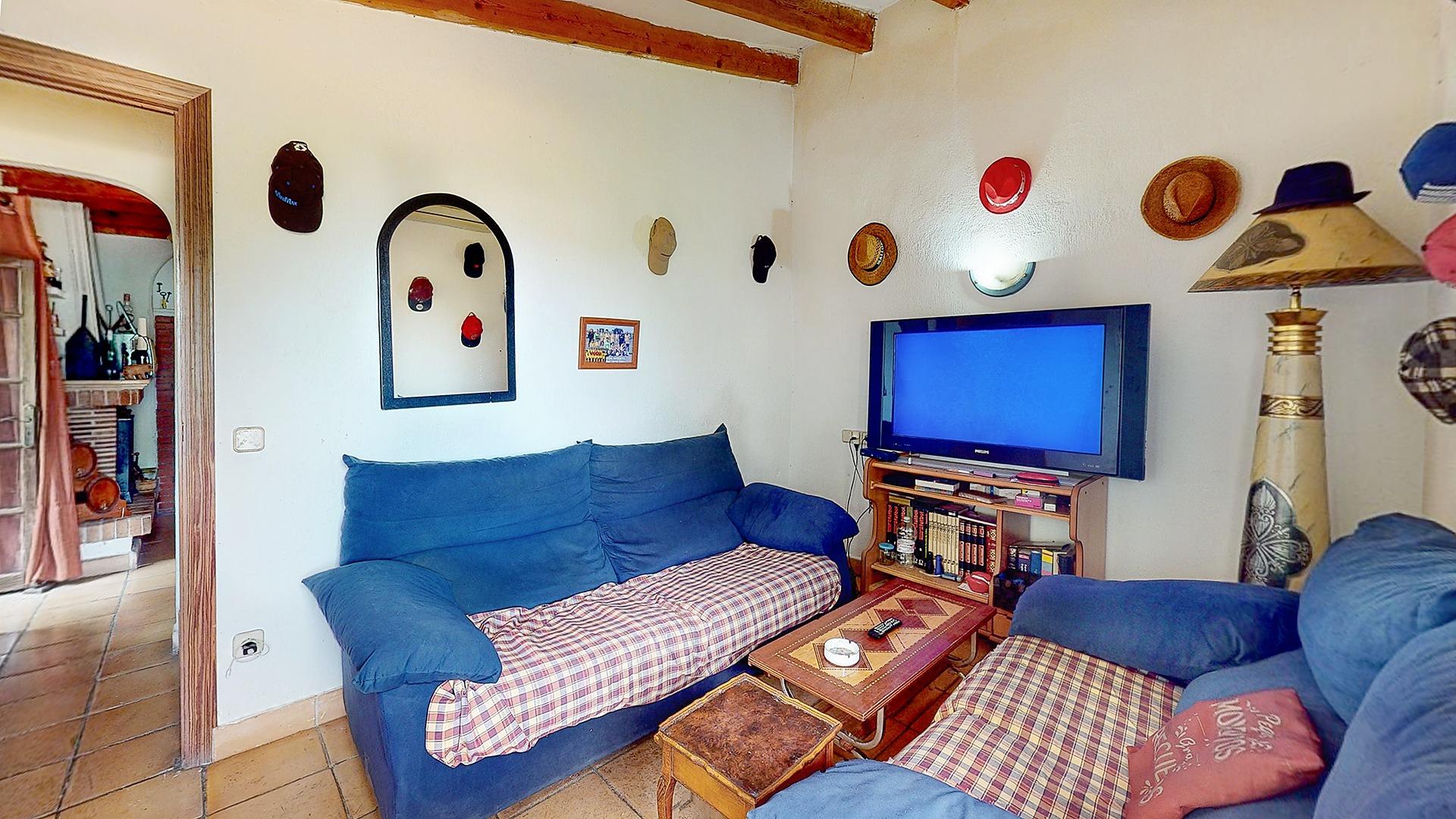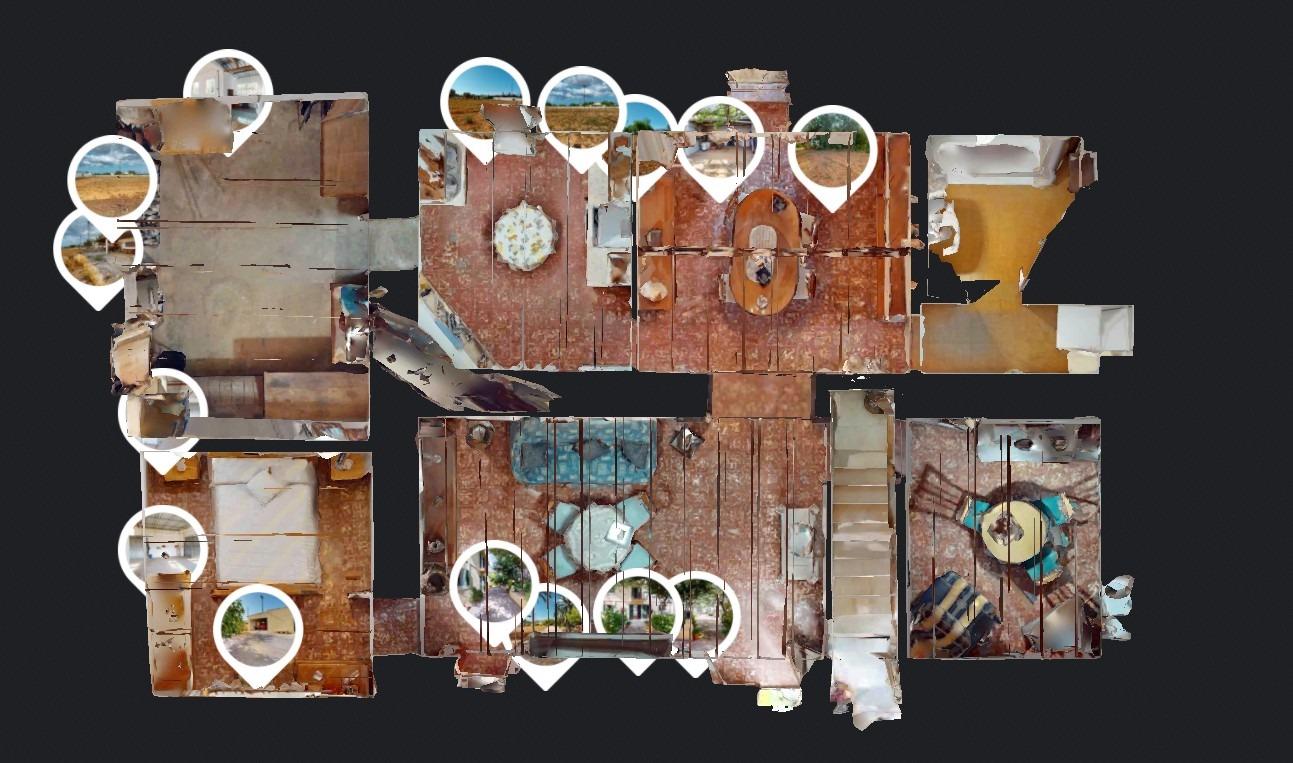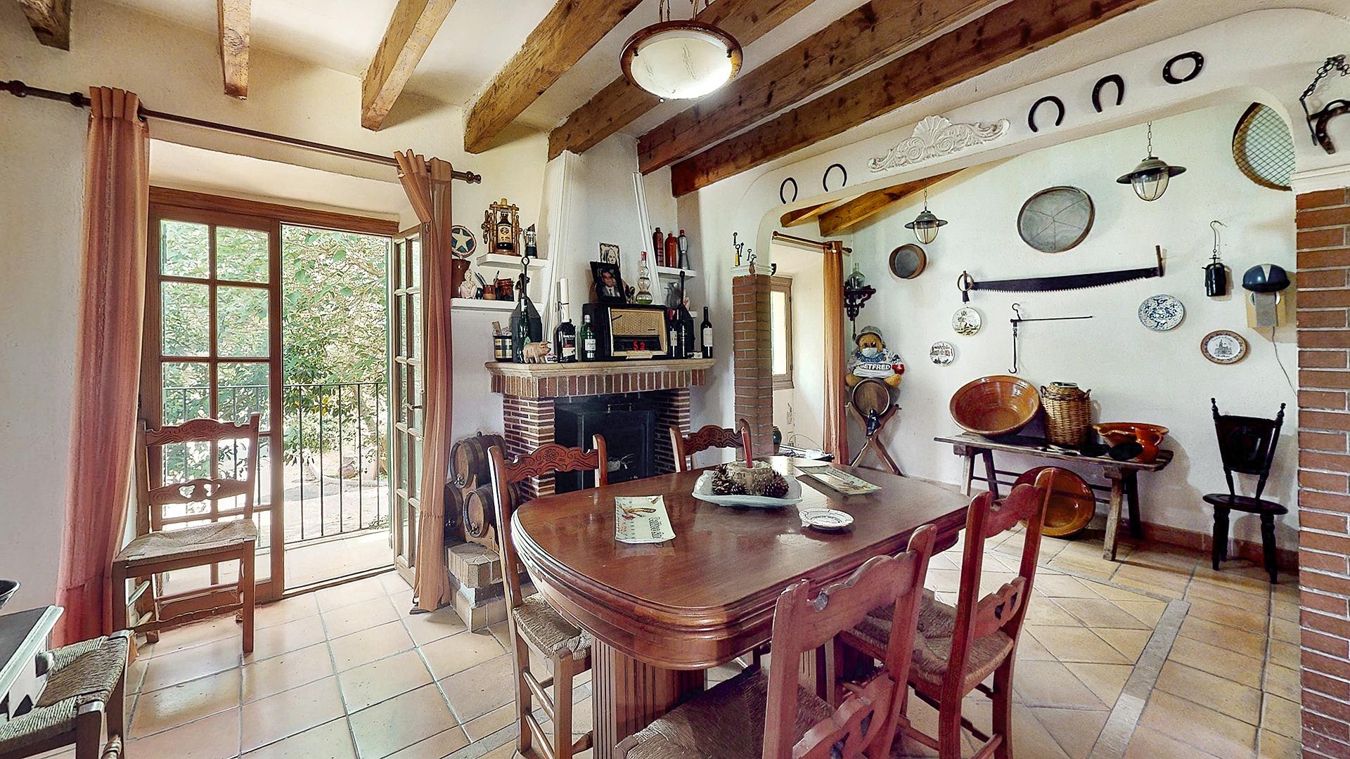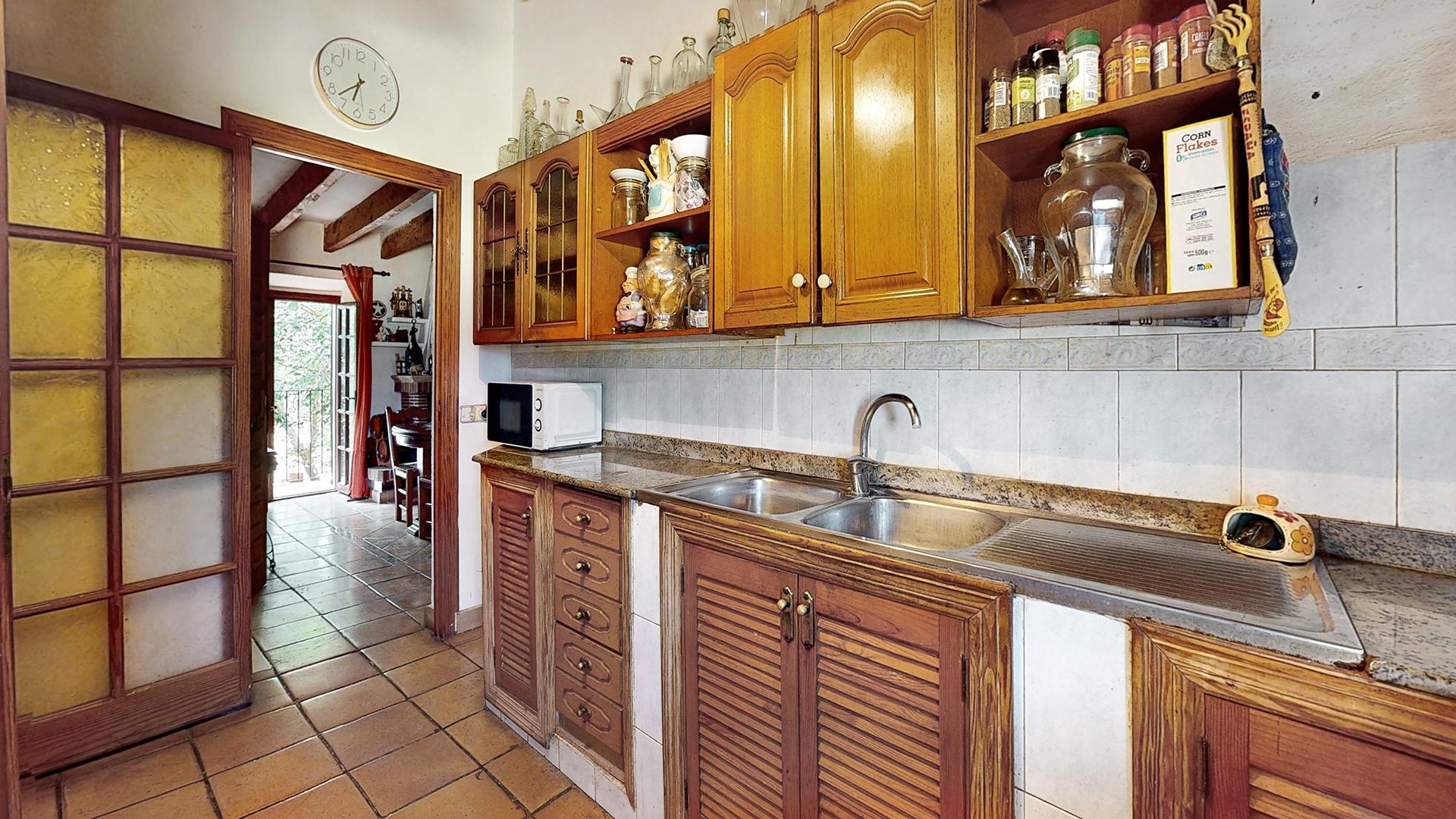 Al entrar nos recibe un comedor distribuido en dos estancias separadas por otro arco y de manera diáfana. Todo con el carácter rústico mallorquín. El salón distribuye la vivienda de arriba en un balcón hacia la parte de entrada de la vivienda (sur), 2 habitaciones dobles y una simple con salida a terraza, un baño y una cocina independiente. Además de otras escaleras que nos dirigen a la terraza de la azotea con vistas 360º del terreno.