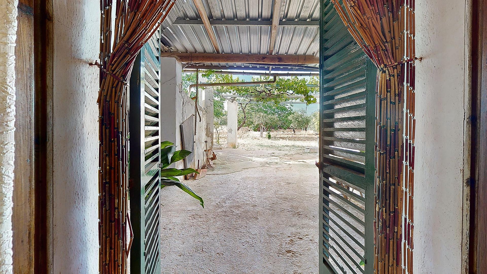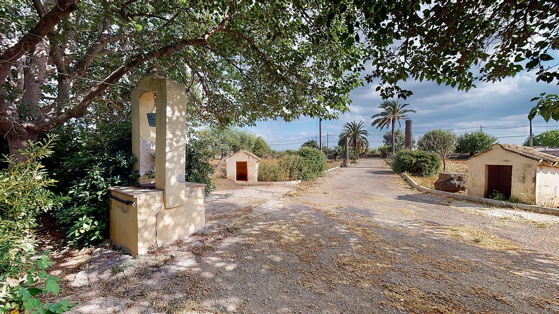 A la parte de la entrada llegamos a través de un bonito camino que separa la tierra de cultivo y escoltado por algunas palmeras que recibe a la vivienda en su centro.