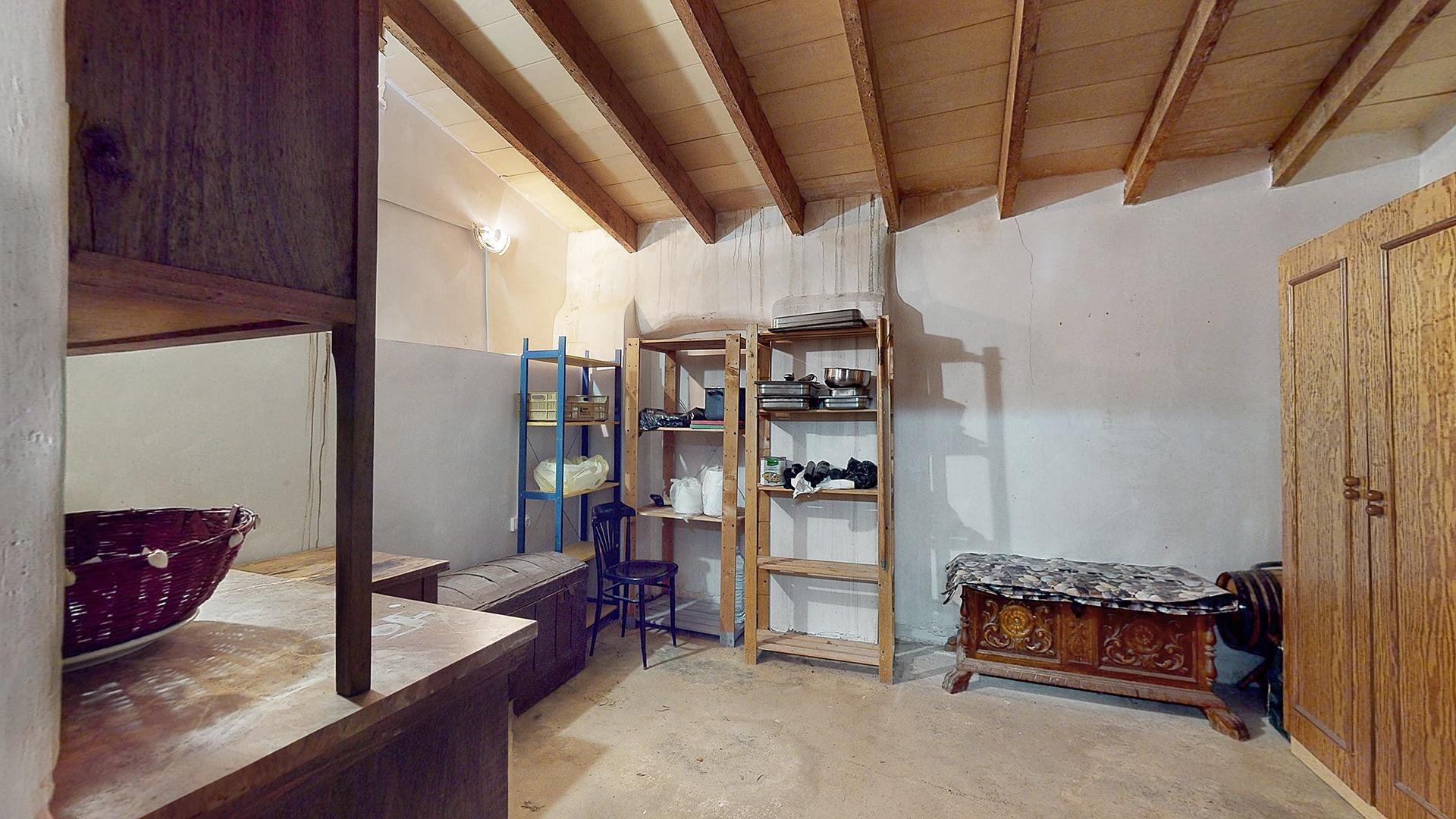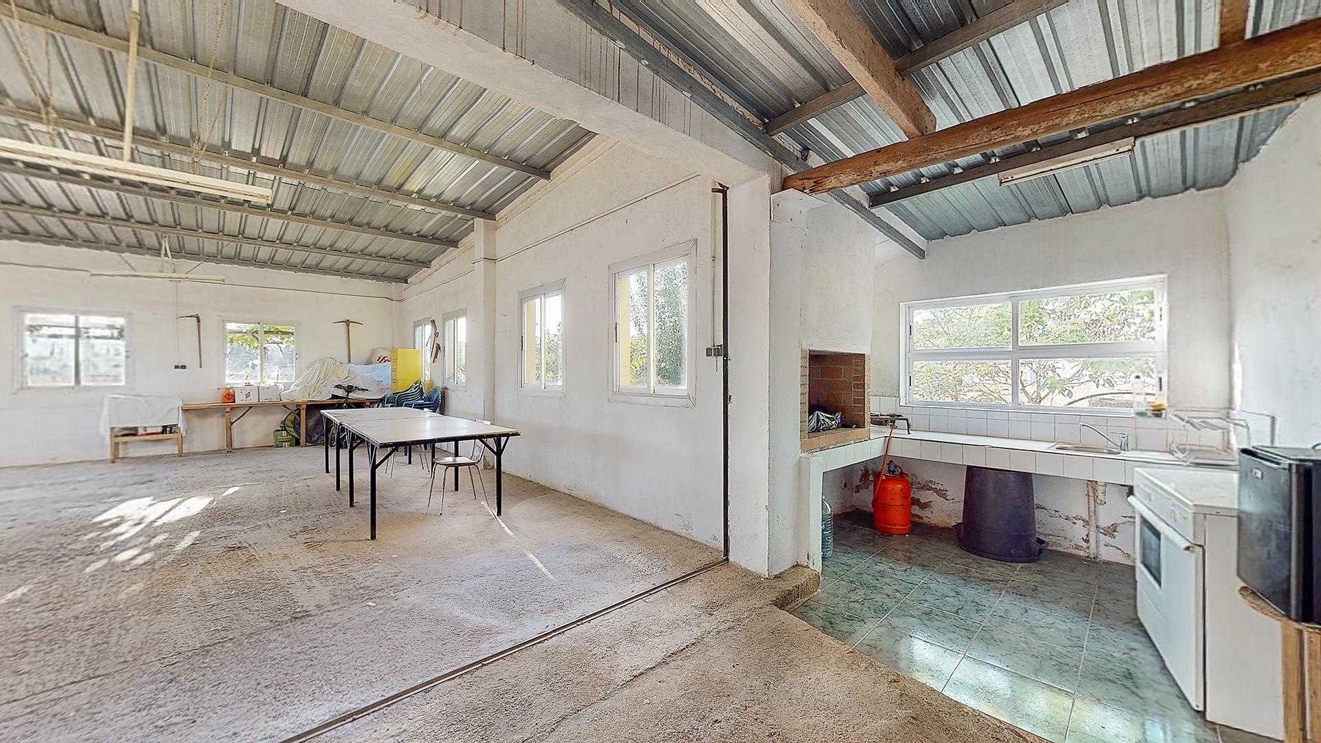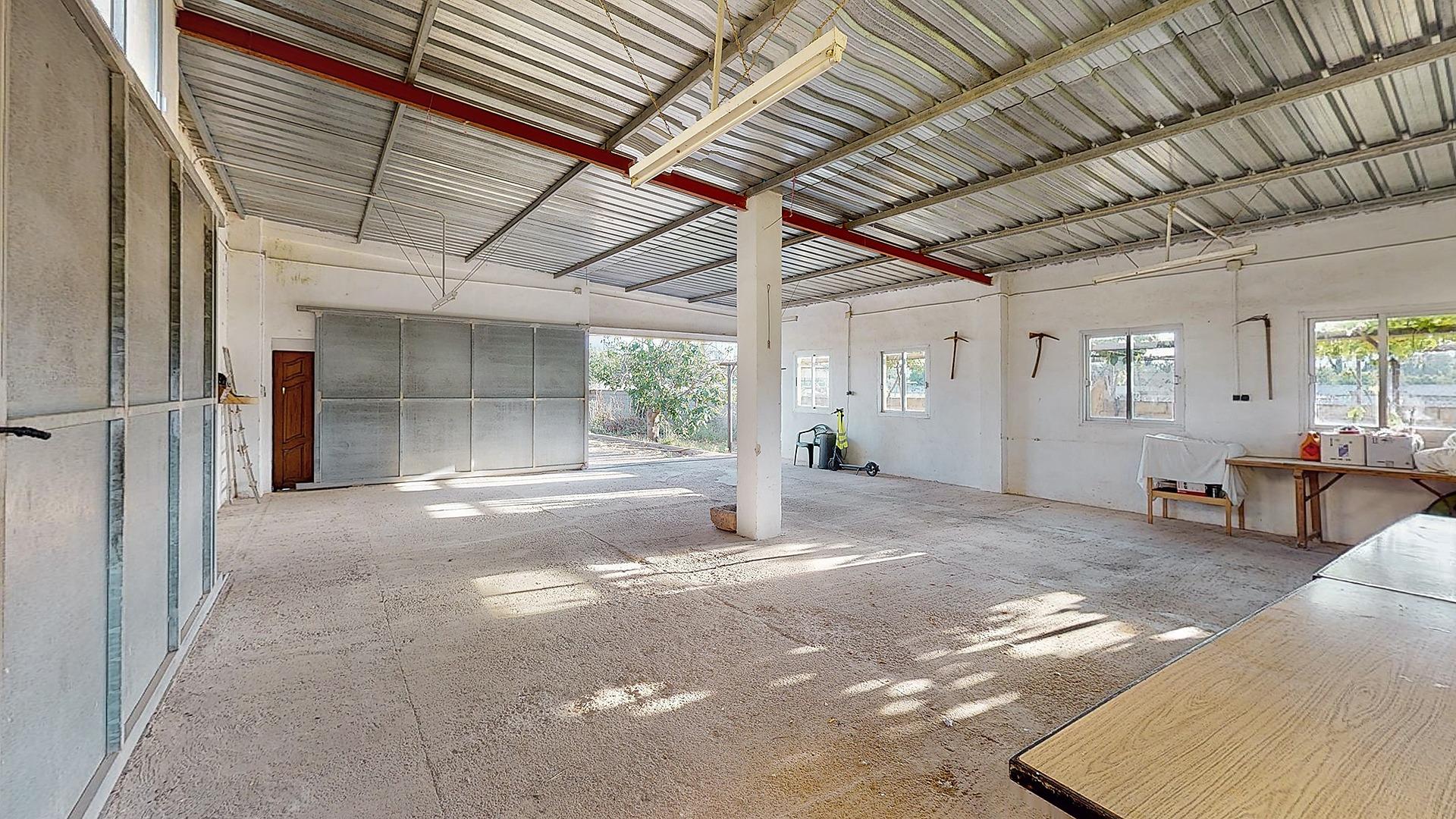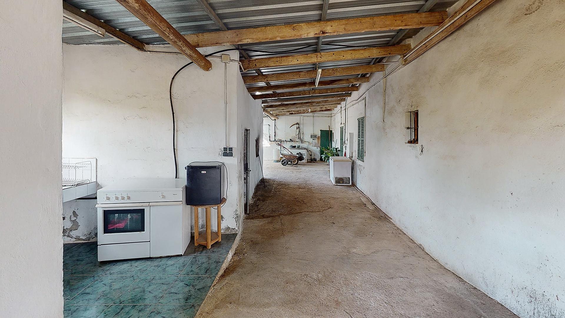 En la parte trasera o accediendo desde el garaje, nos encontramos con un gran patio medio cubierto, con pila con dotación de agua y cuarto para guardar leña, además de un amplio almacén destinado a herramientas agrícolas y elaboración de alimento.