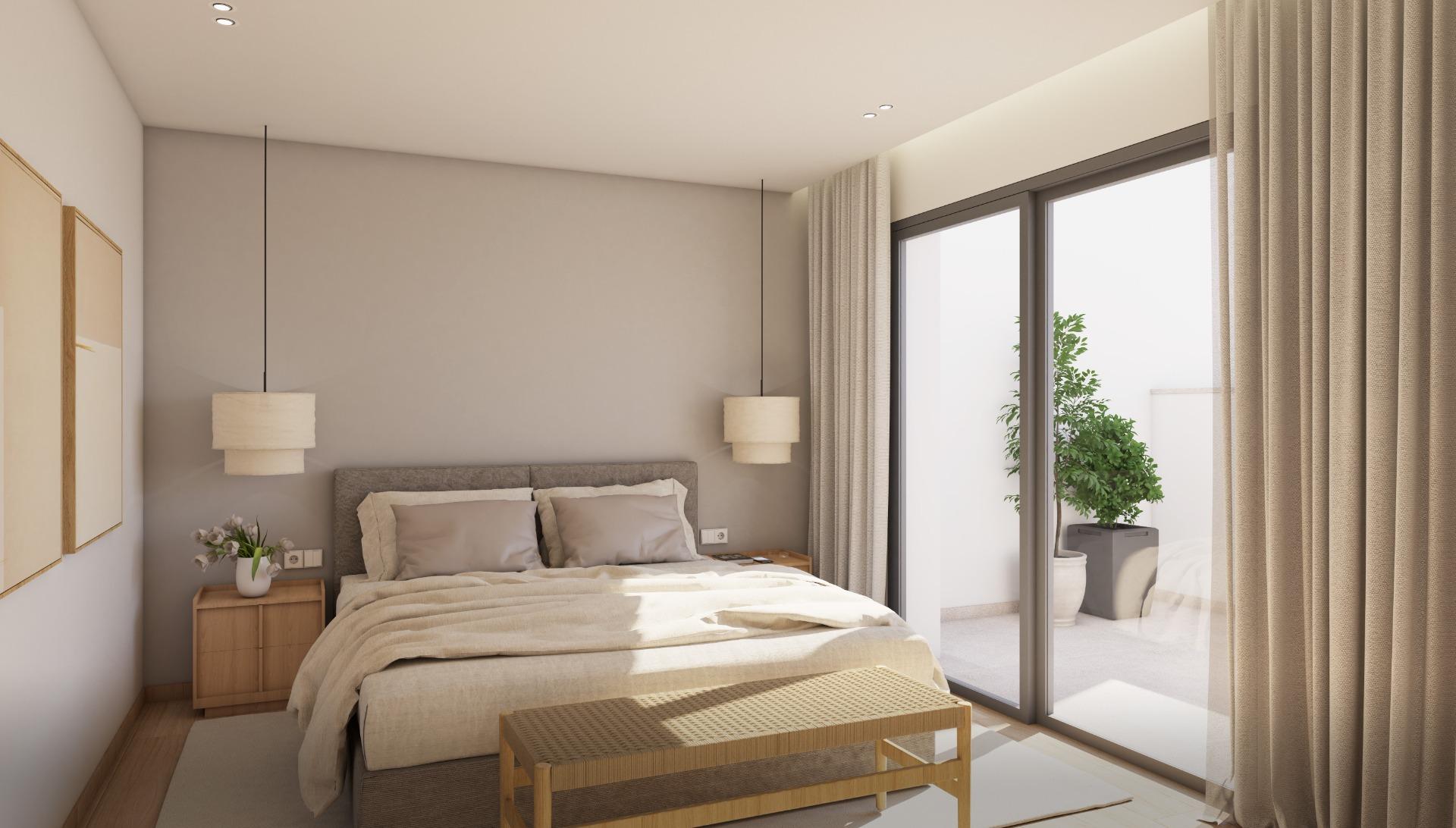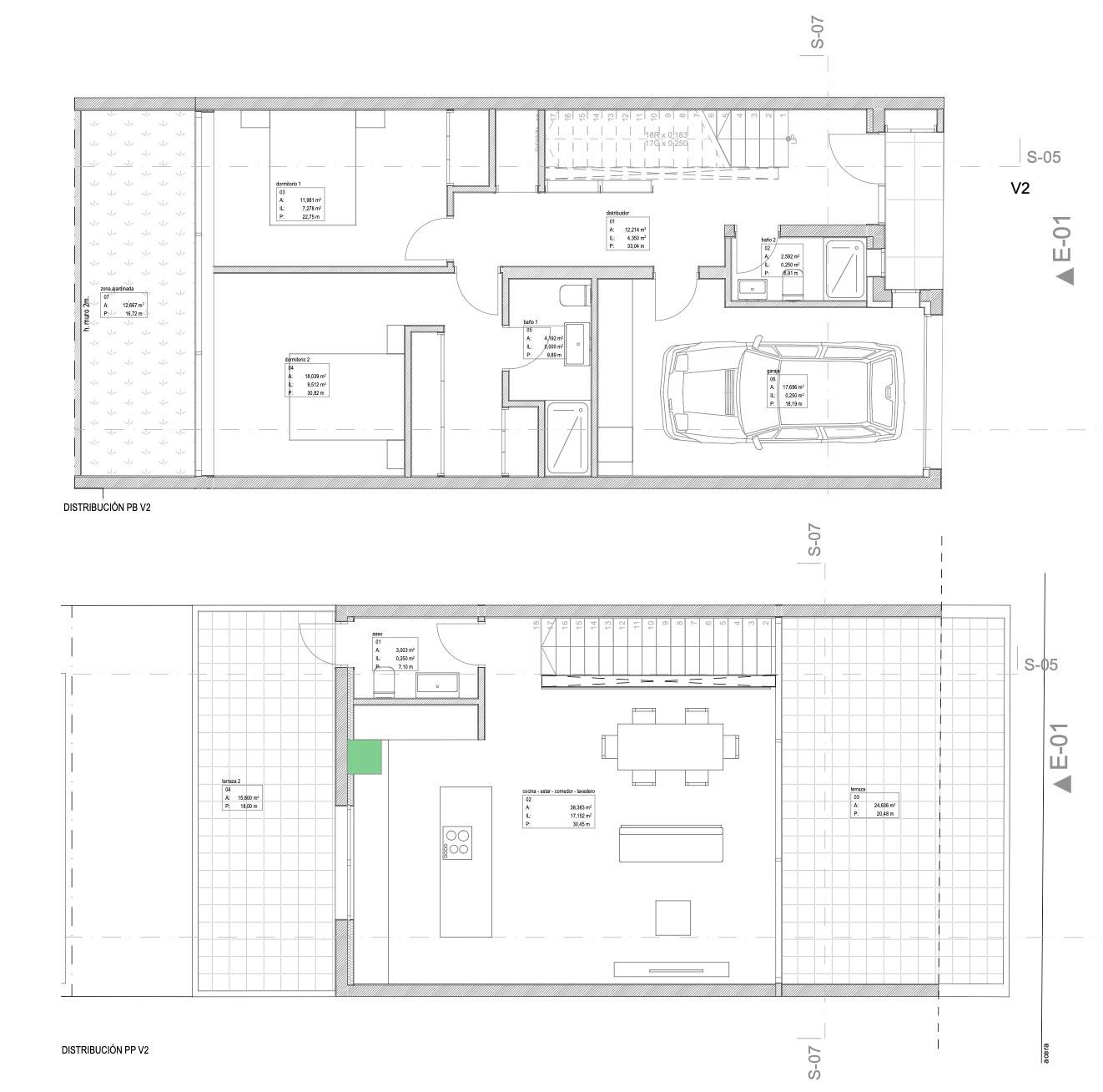 En la planta baja encontramos dos dormitorios, destacando el dormitorio principal con vestidor y baño en suite, así como un segundo dormitorio con armario empotrado, ambos con acceso directo a una terraza que los comunica, creando un espacio íntimo y acogedor. En esta planta también se ubica un baño completo con ducha y el garaje privado.