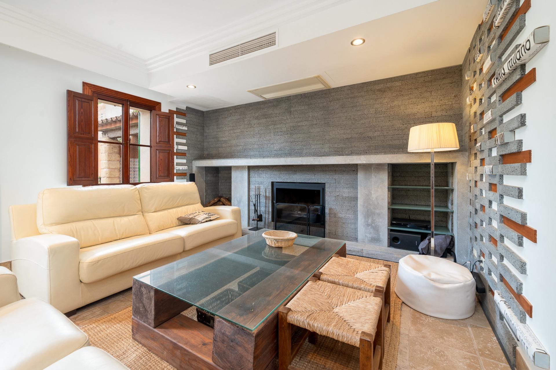 Acogedor salón con chimenea y acceso directo al jardín