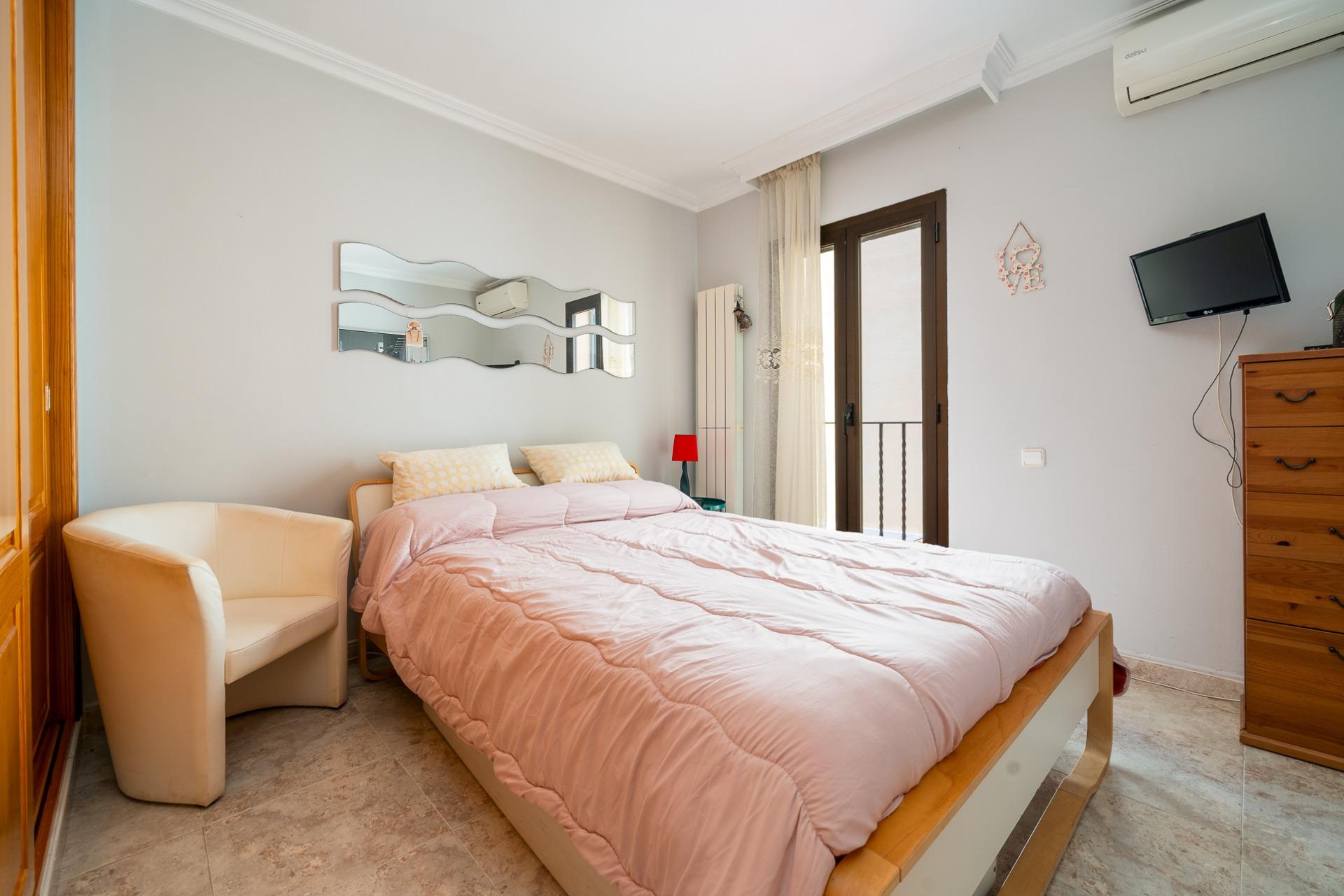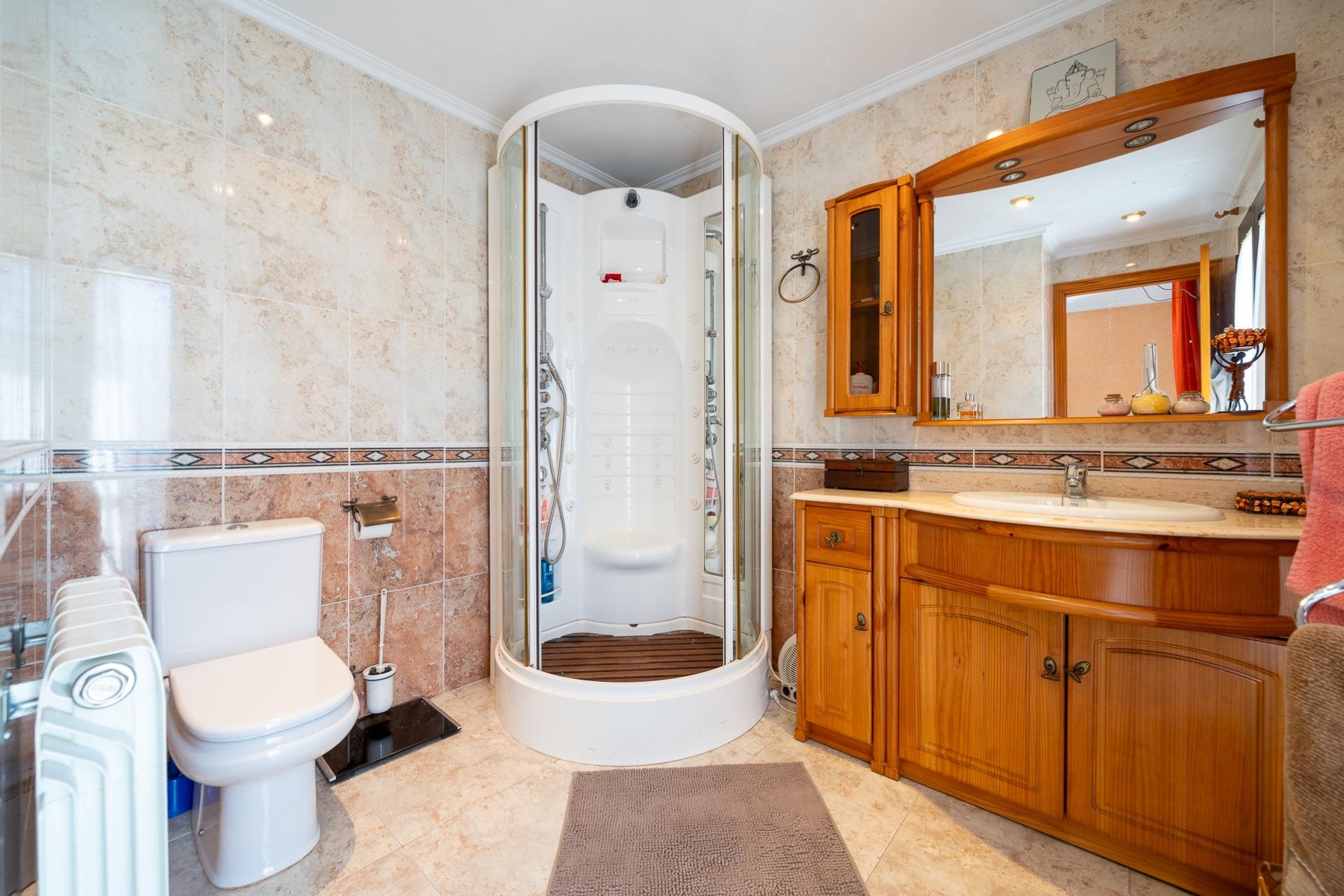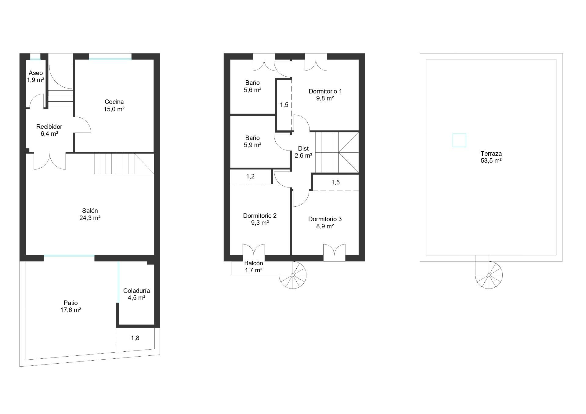 La planta piso, con una superficie construida de unos 54 m2, se distribuye en: tres habitaciones dobles con armarios empotrados, además tendrás a tu disposición dos baños completos; la habitación principal incluye su propio baño en suite. Desde una de las habitaciones, mediante una escalera de caracol exterior, accedemos a una terraza solarium.