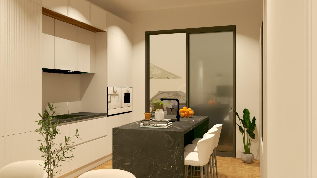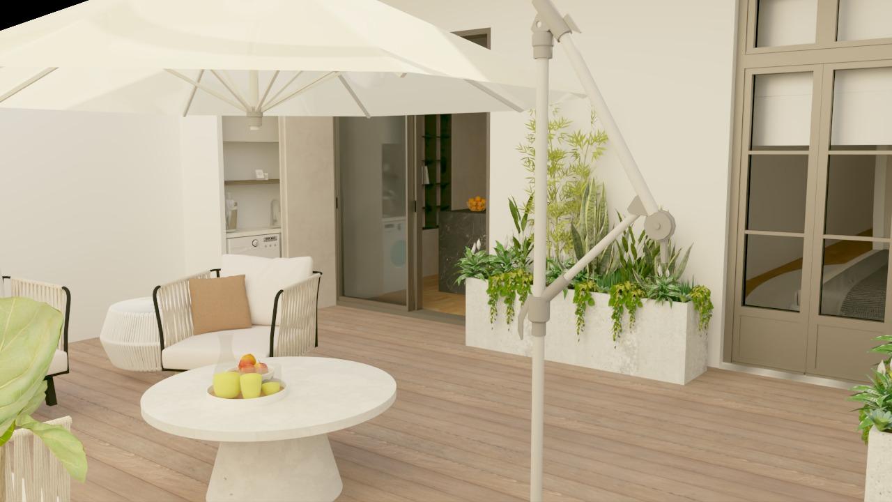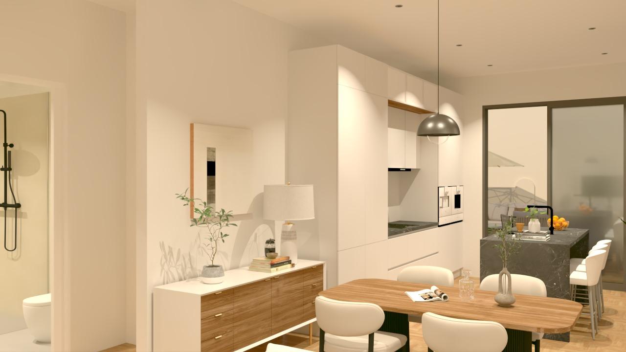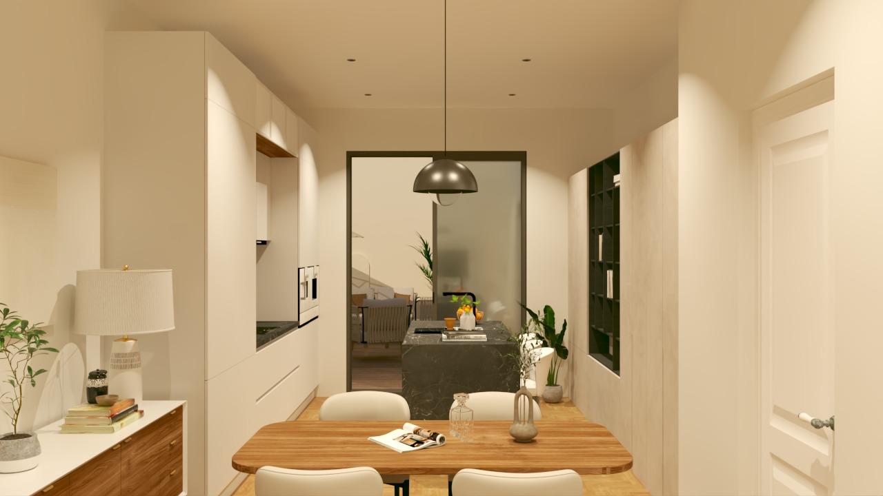 El piso cuenta con una superficie construida de más de 100 m², distribuida de forma tradicional, separando la zona de día de la zona de descanso. La reforma propuesta plantea una redistribución pensada para sacar el máximo partido a la luz natural y a la amplitud de los espacios: un amplio salón comedor con acceso a un balcón exterior, ideal como zona social para recibir amigos o disfrutar en familia; una cocina moderna de concepto abierto, perfectamente conectada al área de estar; y una gran terraza privada de más de 40 m², que se convertirá sin duda en el rincón protagonista de la vivienda, perfecta para crear un oasis urbano con zona chill out, comedor exterior y plantas mediterráneas.