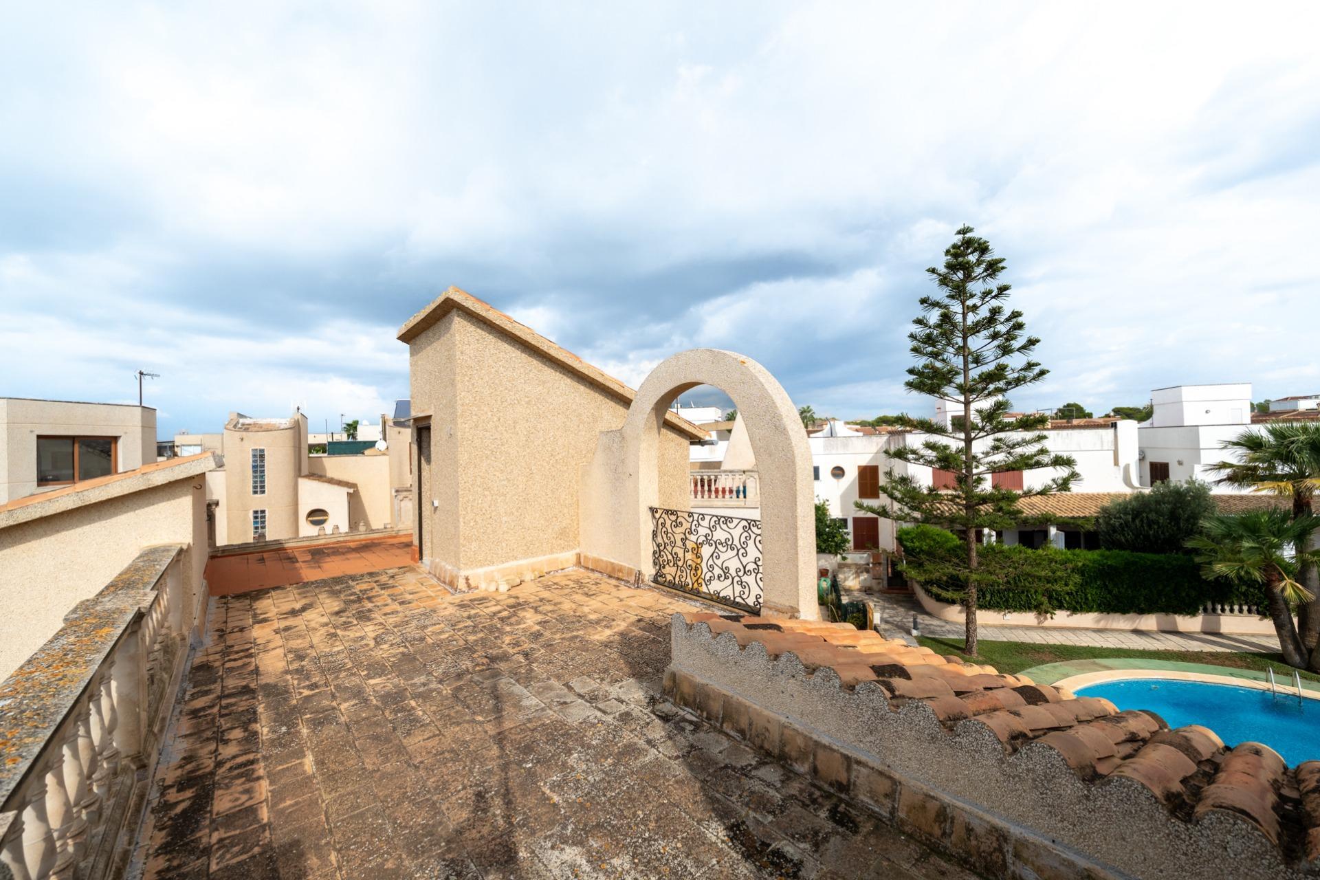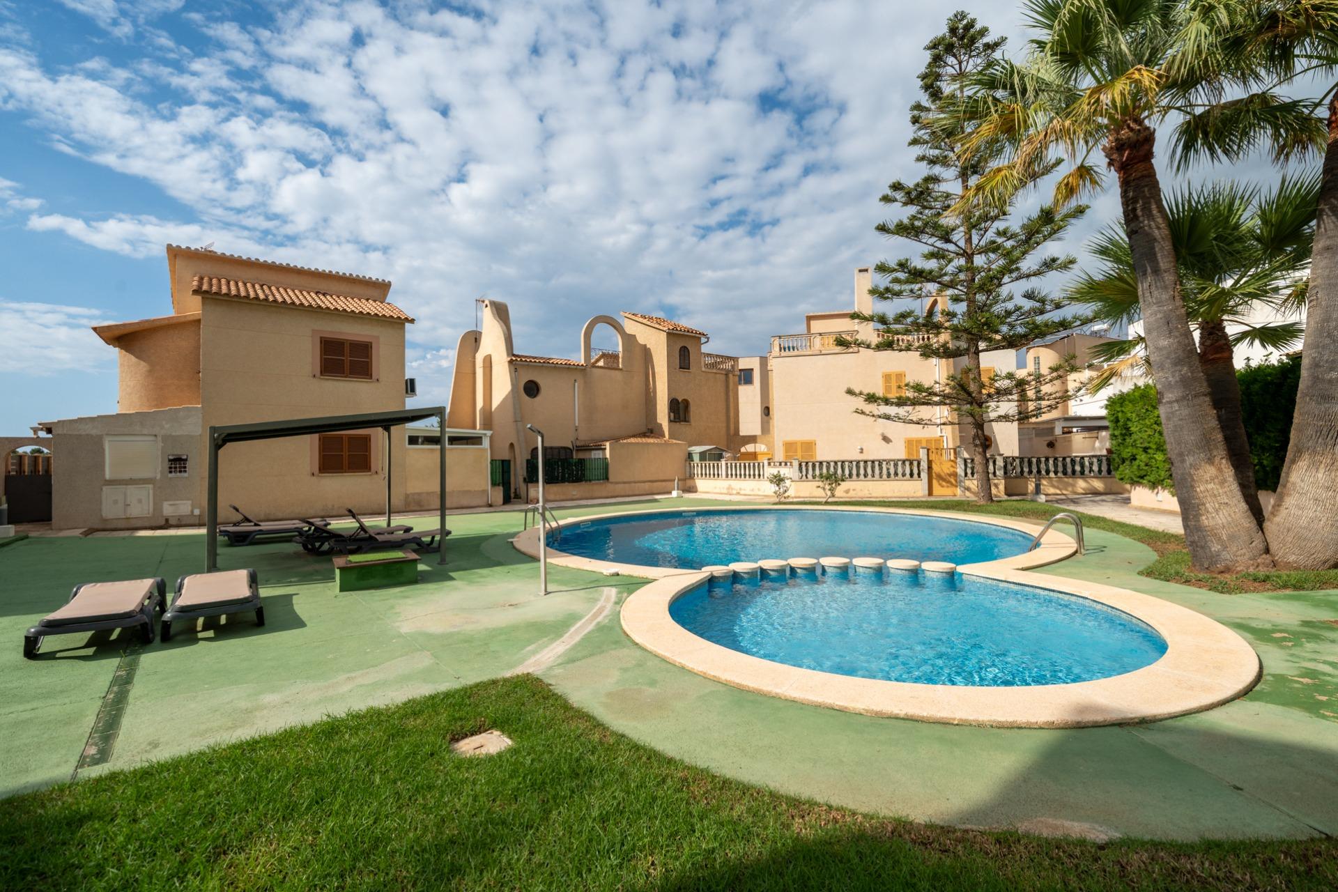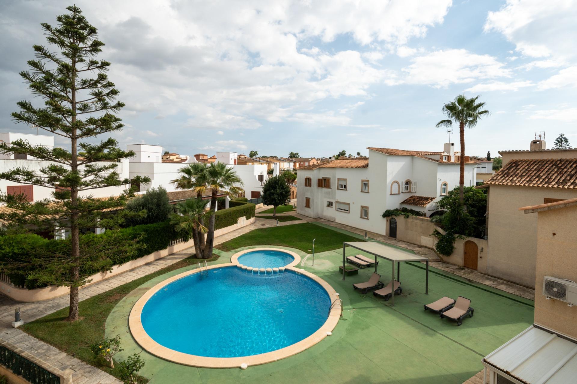 The property is part of a community with a shared swimming pool and also has a parking space included in the price.