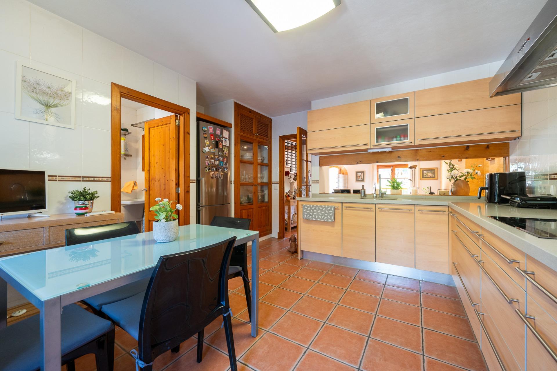 Inside, the living-dining room stands out with high ceilings and exposed wooden beams, creating a warm and character-filled atmosphere. The kitchen provides direct access to the main terrace, ideal for outdoor dining, entertaining or relaxing.