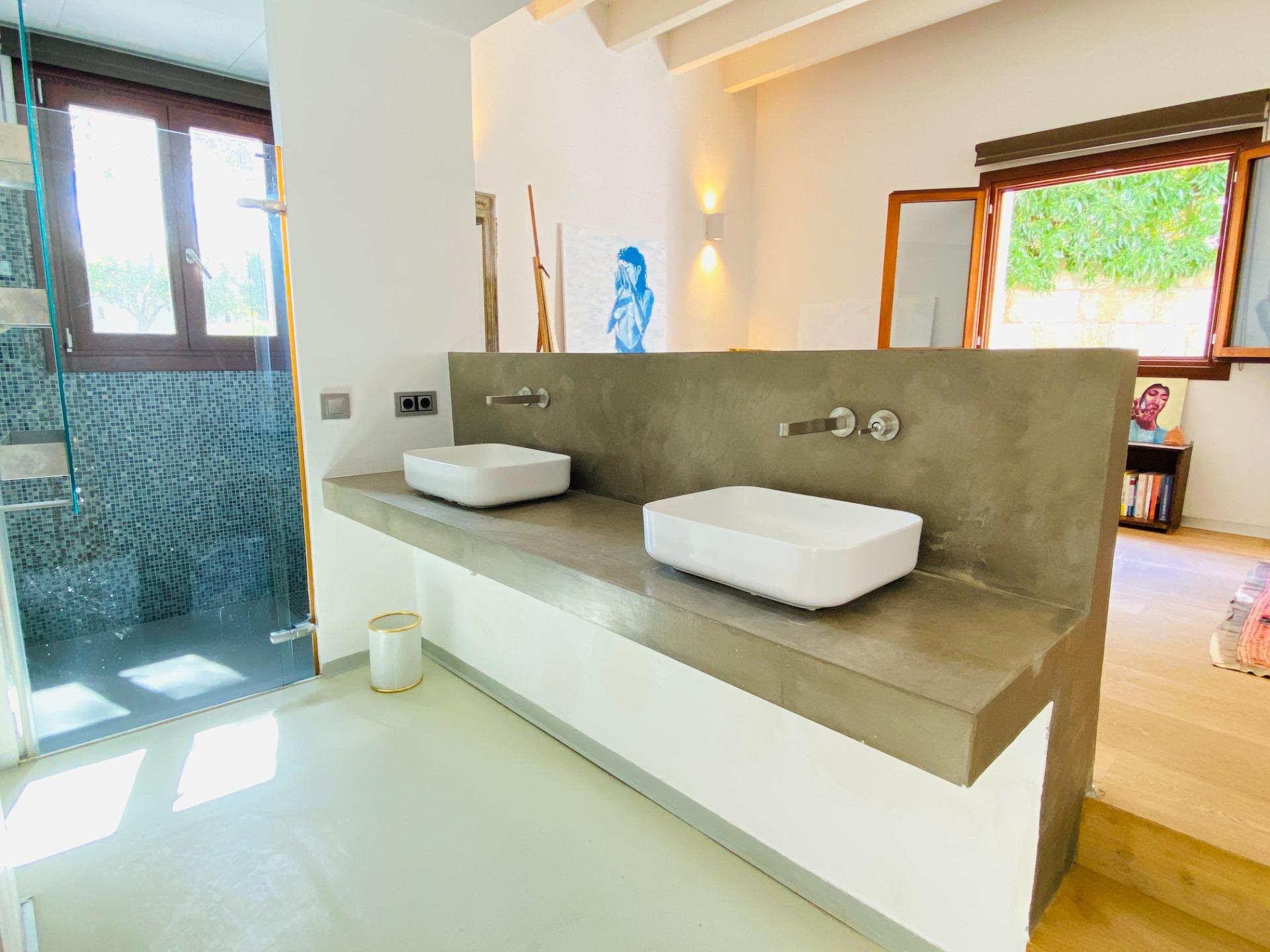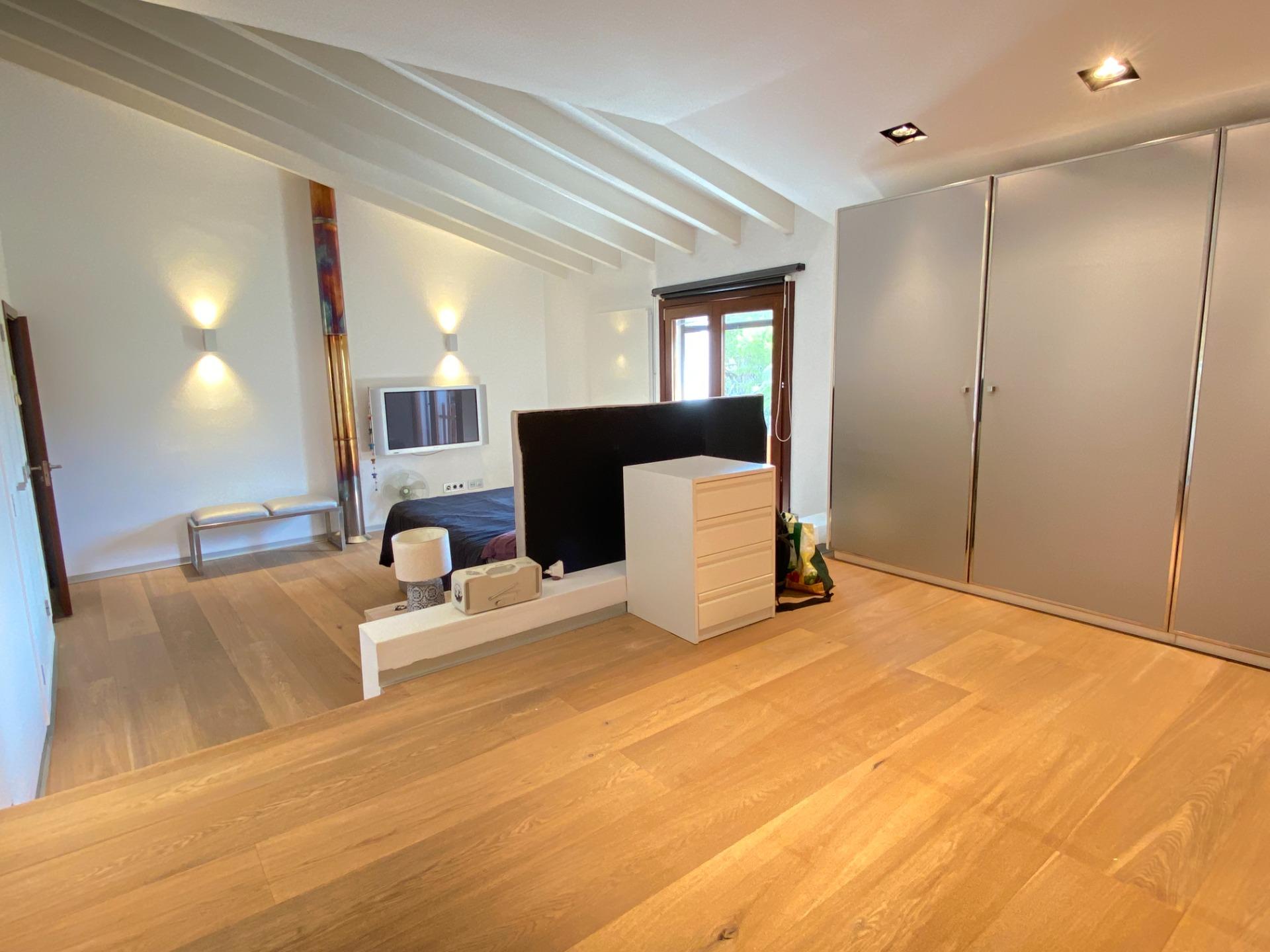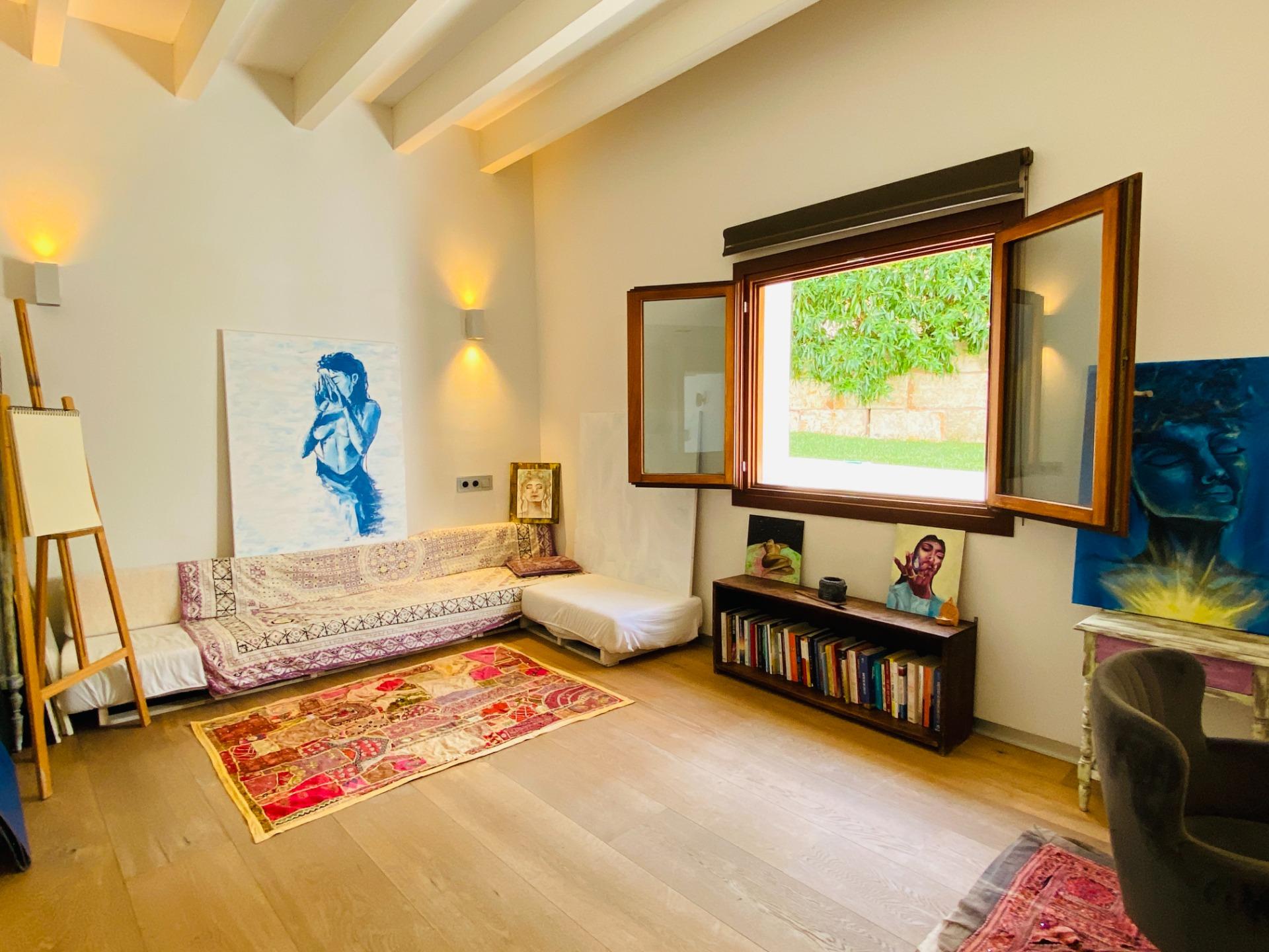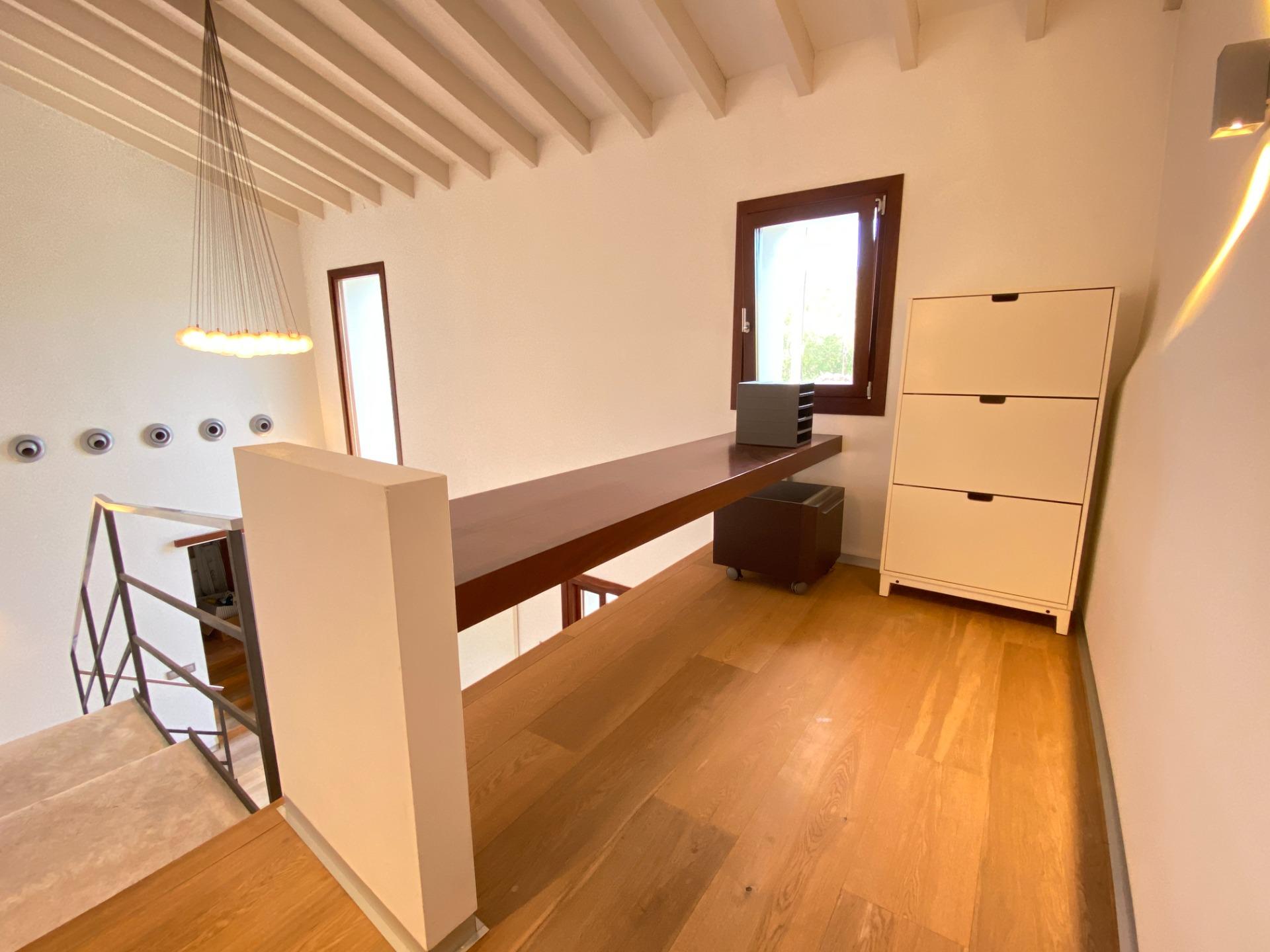 Subiendo a la primera planta por su escalera de hierro forjado, tendrás una zona abierta de oficina o lugar de lectura, una segunda habitación con vestidor y baño en suite y la enorme habitación principal, con su vestidor abierto y su magnifico baño con ducha y jacuzzi, para terminar con un segundo baño turco.
