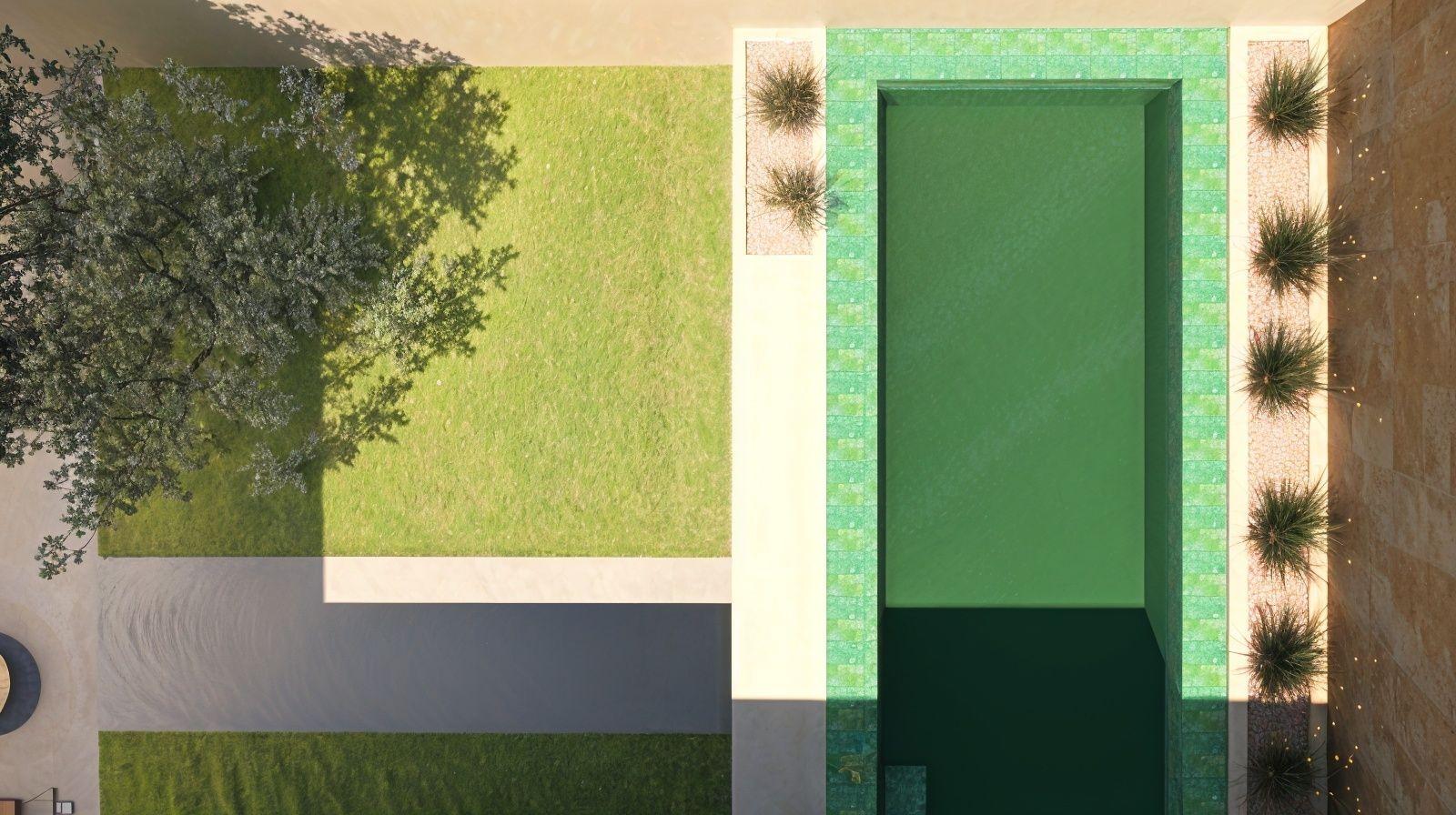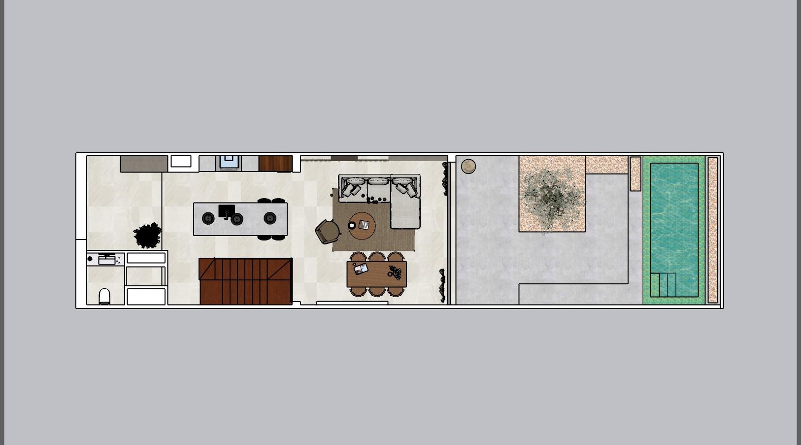 Espacio abierto y acogedor que integra cocina con isla, comedor y saln con salida directa al patio. Este espacio exterior ha sido concebido como una extensin natural del interior: un lugar para leer, compartir comidas al sol o refrescarse en la piscina durante los das de verano. Tambin se ha previsto un aseo de cortesa y zona de almacenamiento. Si se requiriese, existe la posibilidad de aadir una plaza de parking aprovechando la superficie edificable en detrimento del patio.