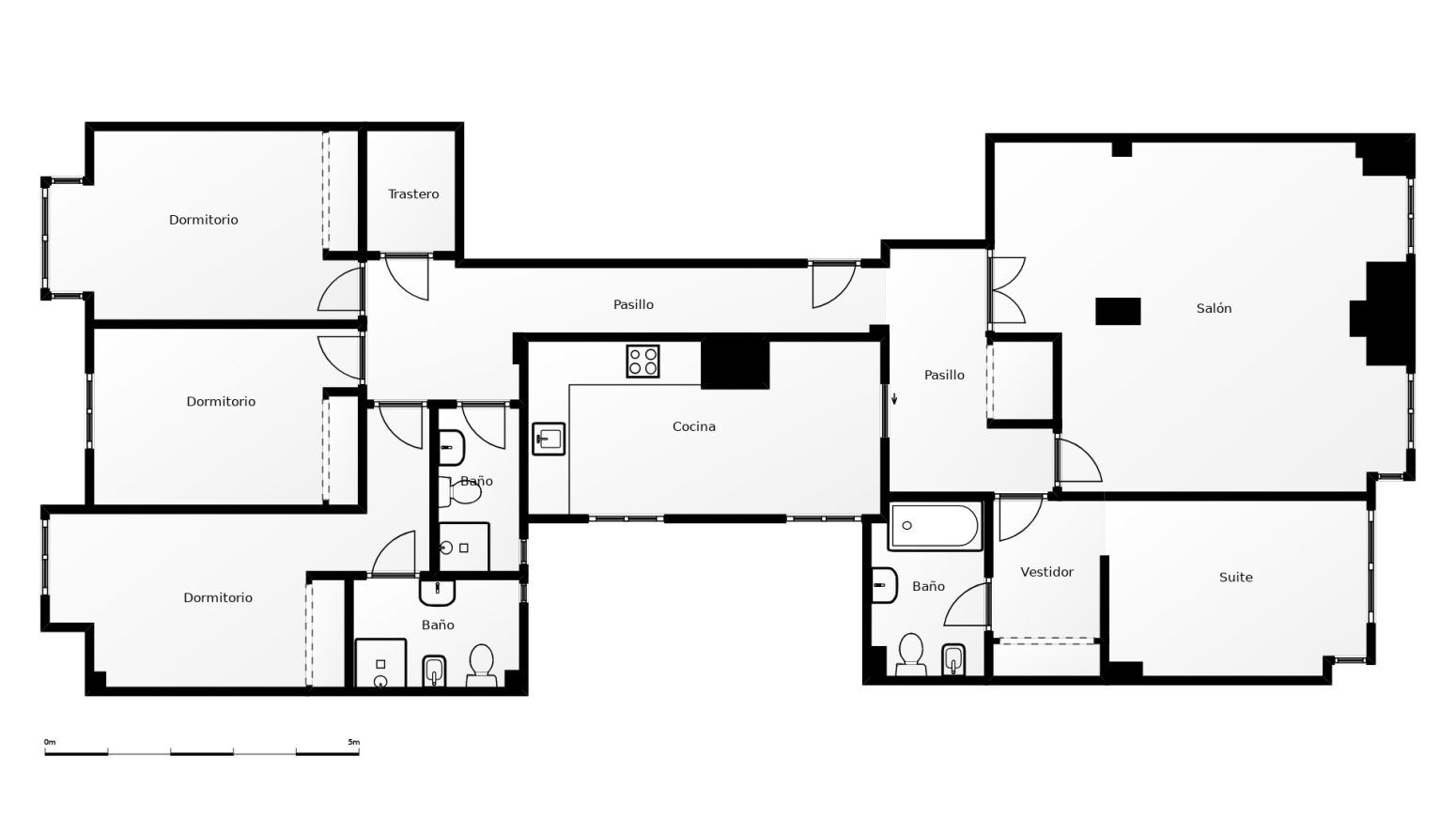 La propiedad destaca por sus generosas dimensiones, que incluyen cuatro amplias habitaciones. Dos de ellas con baño en suite.