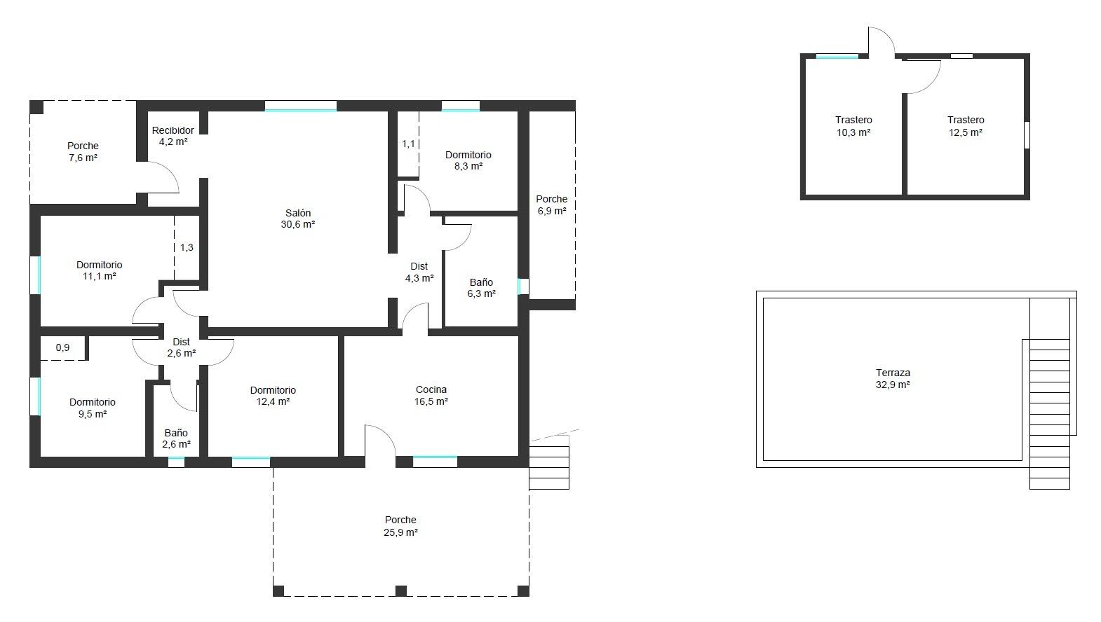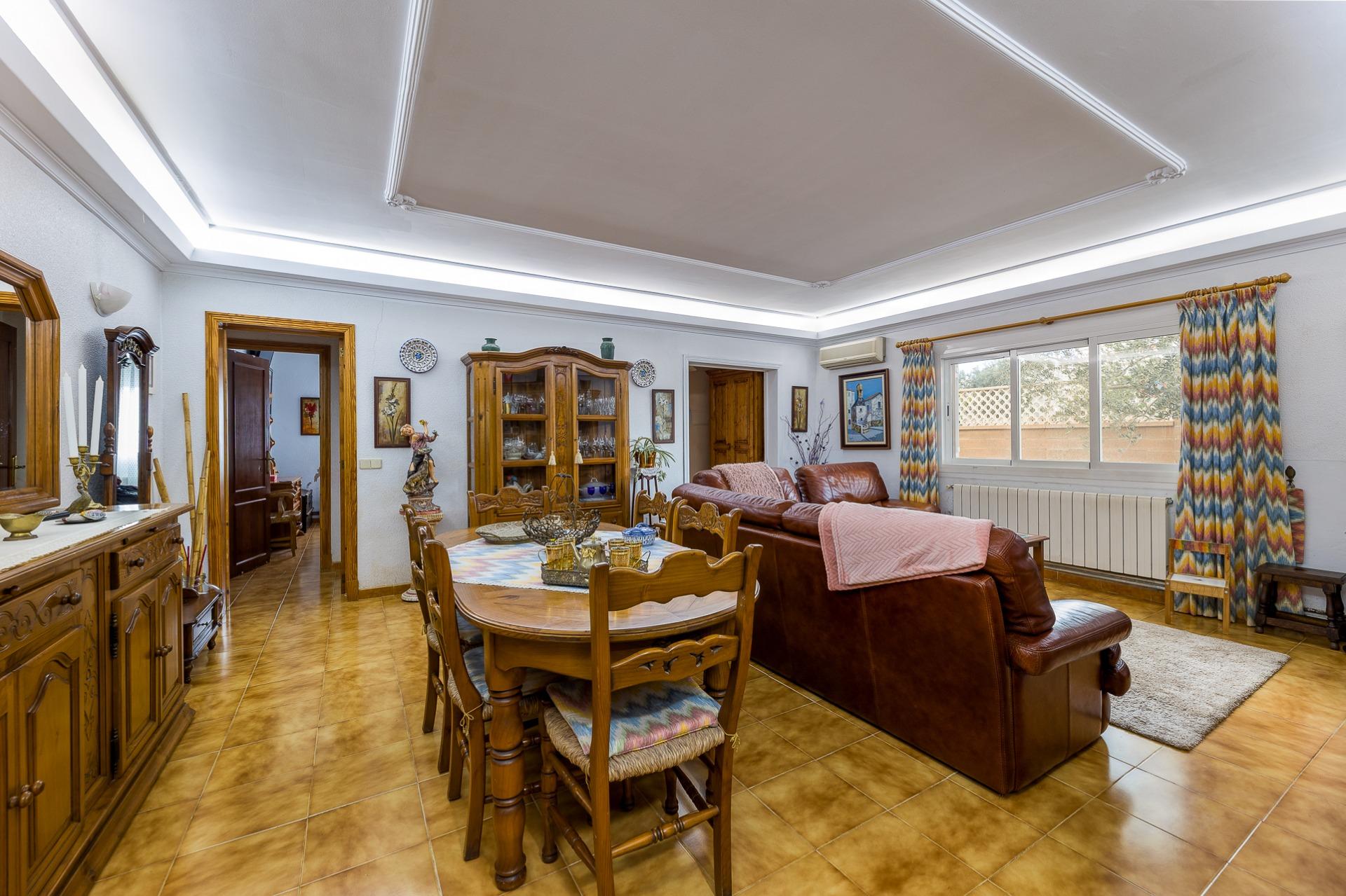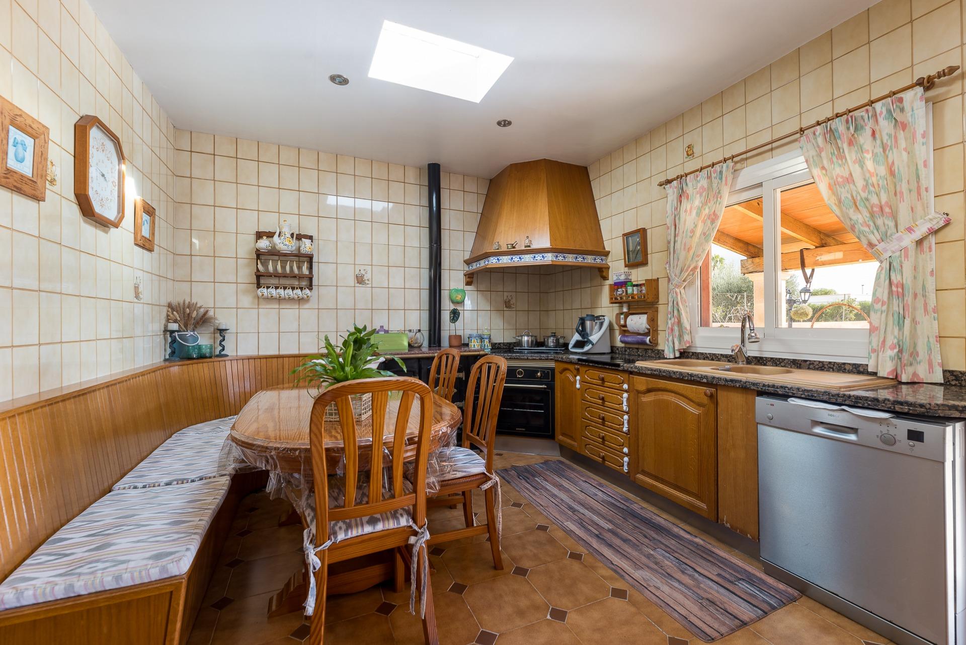 La vivienda principal, construida toda en una planta, consta de 140 m2, distribuidos en 4 dormitorios dobles (3 de ellas con armarios empotrados), 1 baño completo con ducha, 1 aseo de cortesía, cocina amueblada e independiente, salón-comedor con chimenea, amplio porche cenador y terraza la cual rodea la vivienda.