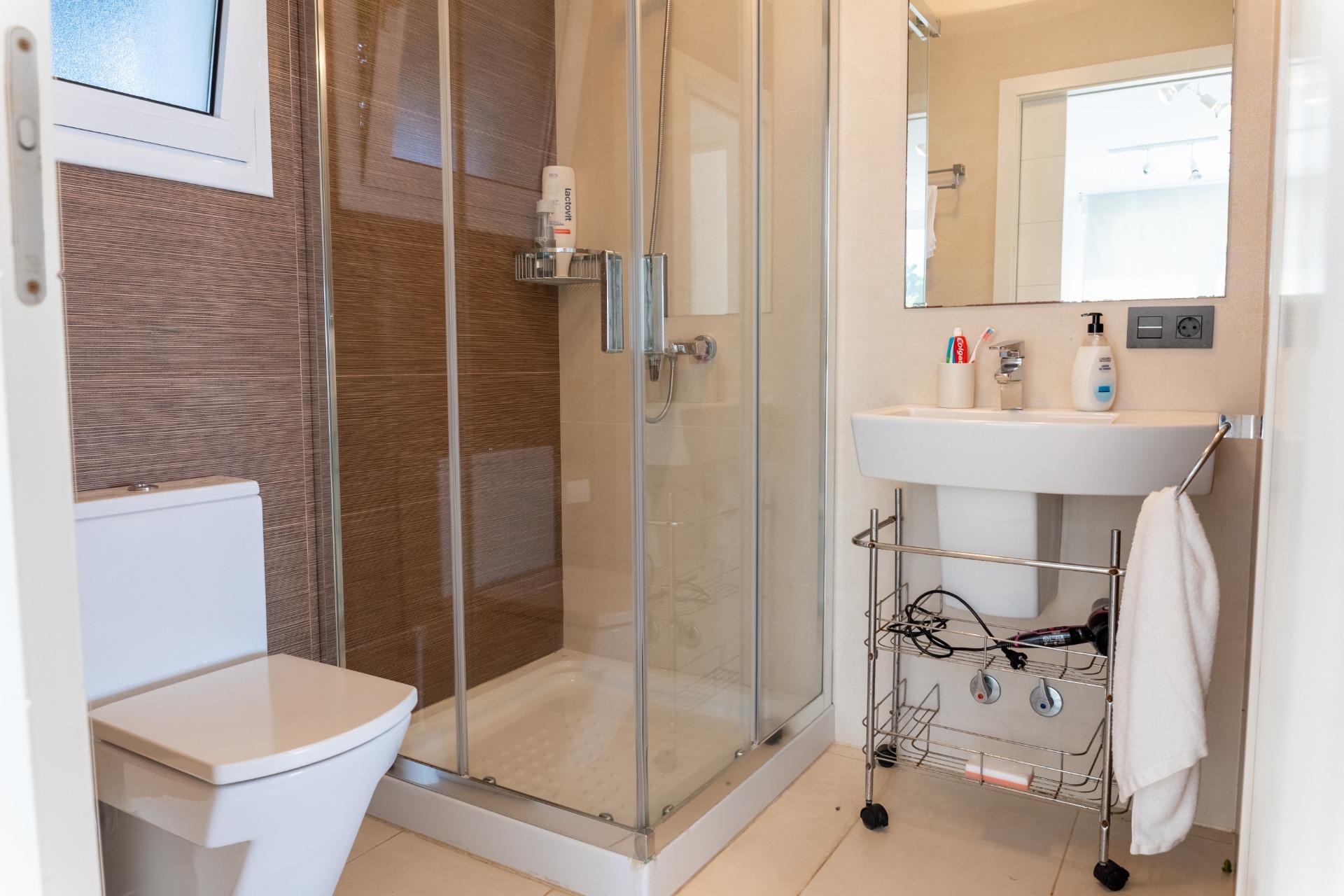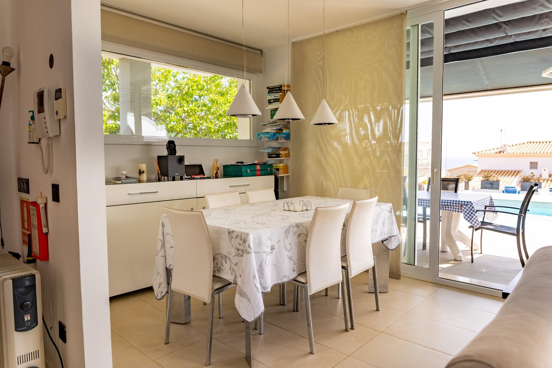 Si bien el chalet tiene una entrada principal con puertas de madera maciza, la cristalera del salón comedor se convierte en el sitio idóneo para entrar y salir, y como no, si tiene cuando sales de frente la piscina.