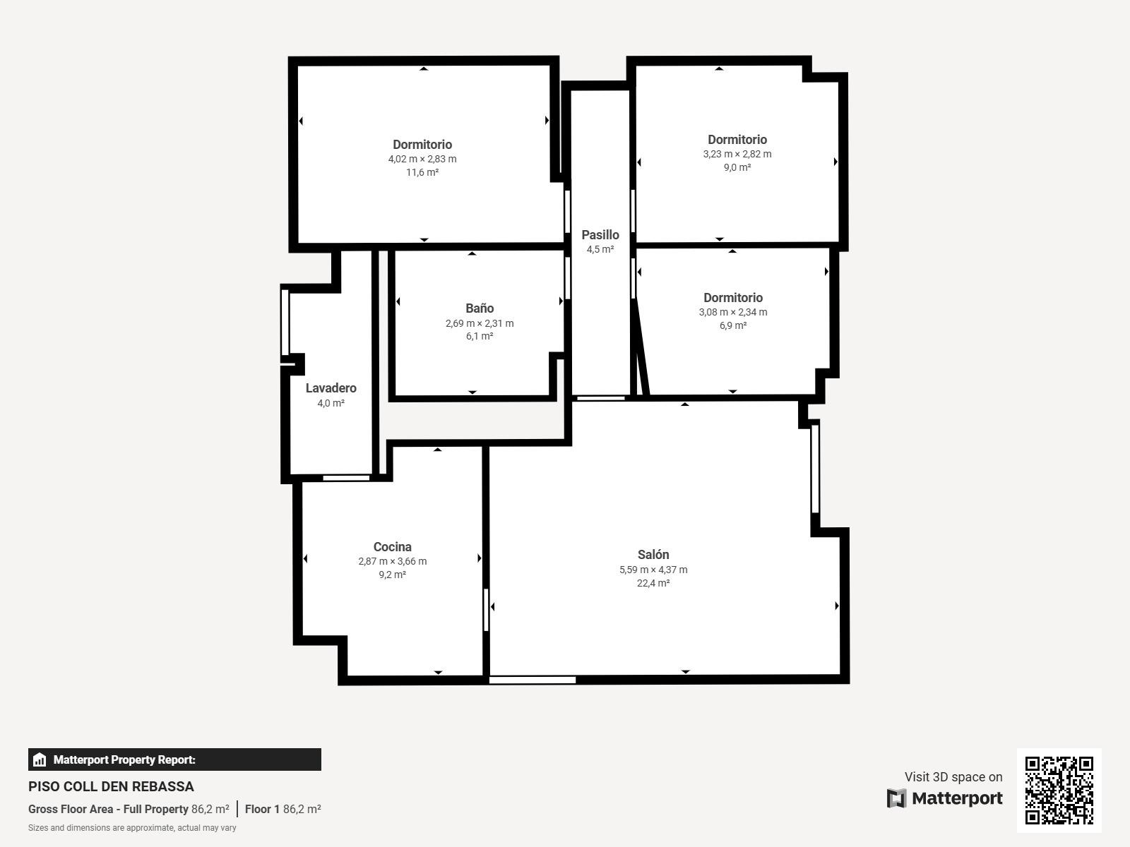 La distribución es ideal, con un luminoso salón de 22,40 m², perfecto para disfrutar de momentos en familia o con amigos. La cocina independiente de 9,20 m², cuenta con un diseño práctico que permite aprovechar al máximo el espacio. También tiene un pequeño balcón. La zona de descanso se compone de dos habitaciones dobles, ambas con armarios empotrados, y una habitación sencilla, ideal como despacho, vestidor o dormitorio individual. Además, la vivienda dispone de un baño completo, ofreciendo comodidad para toda la familia.