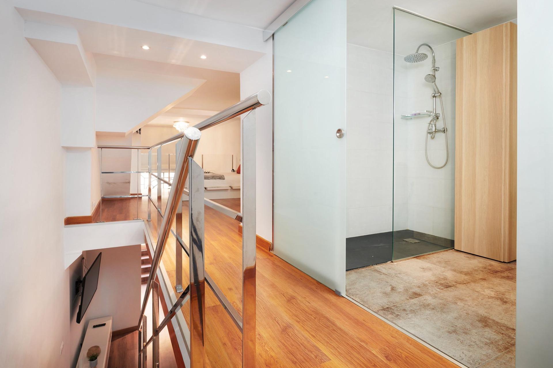 Al subir las escaleras, encontramos un amplio dormitorio doble con armario empotrado, que ofrece vistas tanto al elegante salón como a la vida animada del barrio. Además, dispone de un baño completo muy bien distribuido.