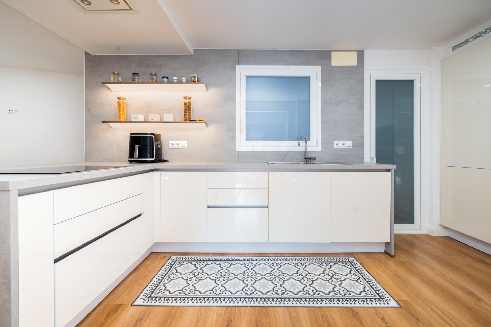 El inmueble está estratégicamente distribuido en cuatro habitaciones dobles bien iluminadas, ideales para familias o para quienes buscan espacio adicional, con armarios empotrados en todas las habitaciones, para optimizar el espacio. Cuenta también con dos baños completos, uno de ellos en suite con ducha y otro para invitados con bañera. Dispone también de zona de coladuría, con lavadora y secadora, así como una pila para lavar a mano las prendas más delicadas.