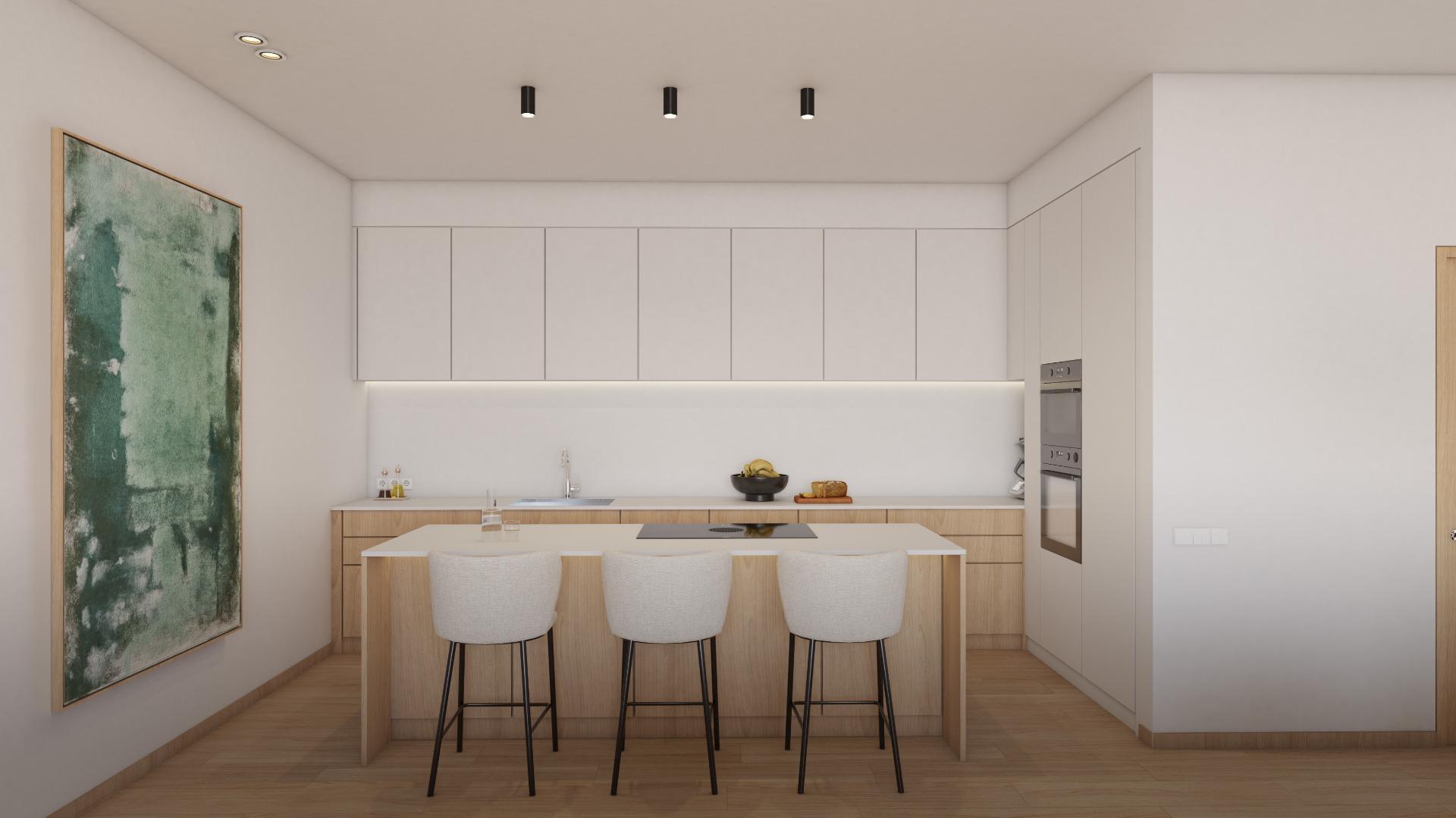 La primera planta, a la que se accede mediante escalera interior, alberga el espacio destinado a cocina office abierta con isla, la cual se presupuesta aparte, permitiendo al futuro propietario personalizarla según sus gustos y necesidades, integrada en un amplio y luminoso salón comedor, además de un aseo de cortesía. Desde aquí se accede a dos terrazas adicionales, una interior y otra frontal con orientación sur y vistas semi despejadas.