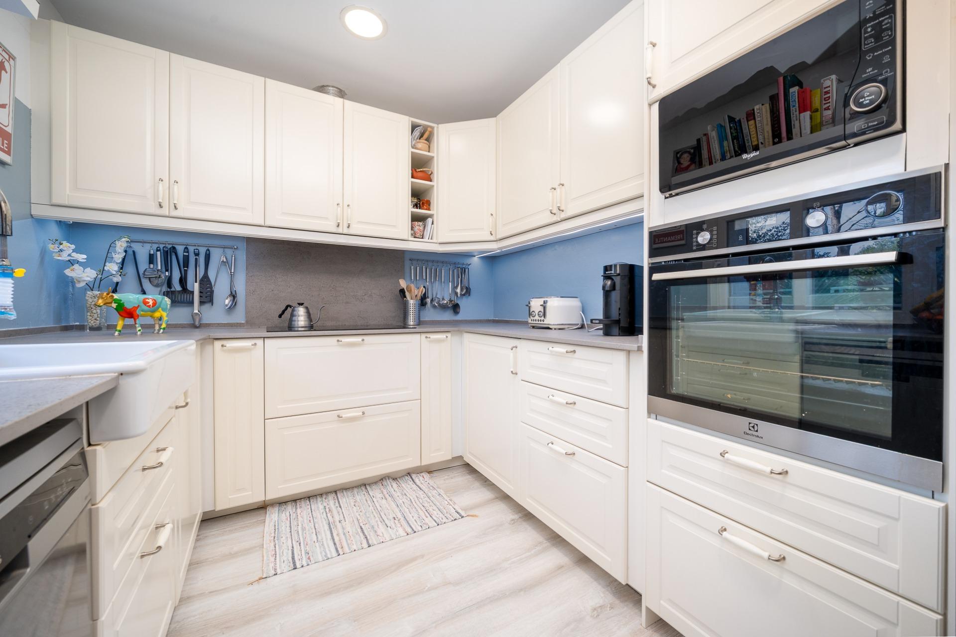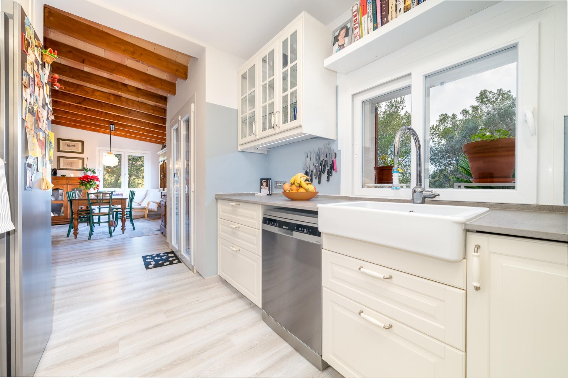 En el interior, destaca especialmente la cocina abierta integrada con la zona de estar, creando una sensación de amplitud, confort y continuidad perfecta para la vida en familia o para recibir invitados. Los acabados incluyen carpintería interior de madera y carpintería exterior con cristales Climalit, así como contraventanas de teka, que contribuyen al confort térmico y acústico.